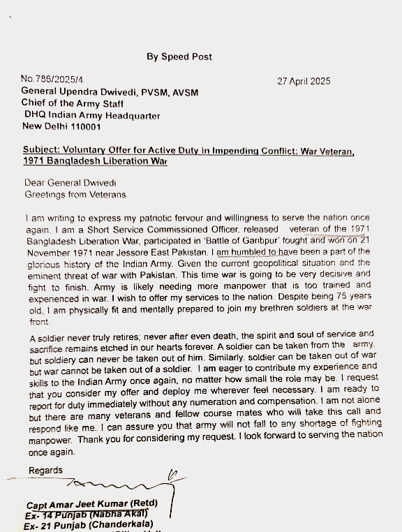 New Delhi: In the aftermath of the dastardly terrorist attack in Jammu and Kashmir’s Pahalgam on April 22, a 75-year-old war veteran wrote to the Indian Army chief, General Upendra Dwivedi and offered to join the service once again, voluntarily.