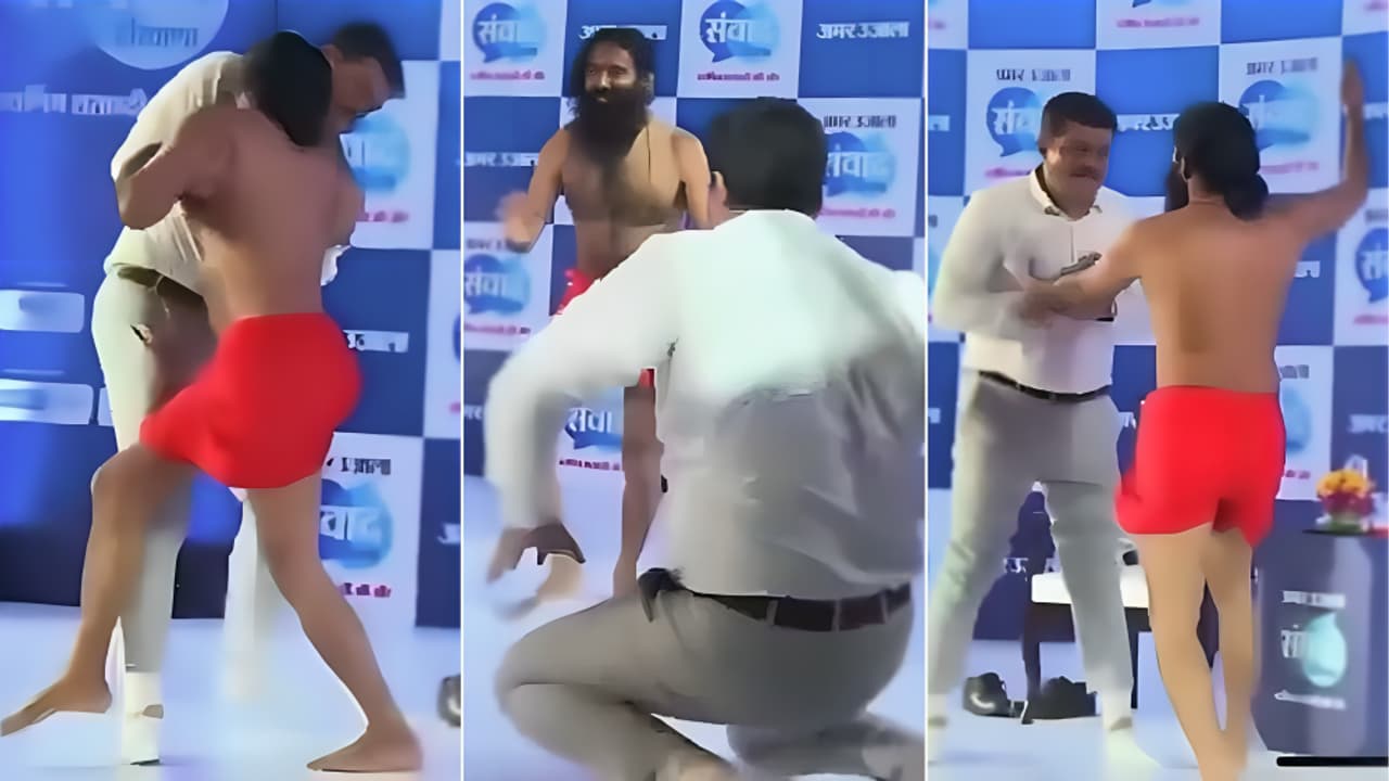A video of Baba Ramdev wrestling a journalist during a live event has gone viral. The journalist turned out to be an experienced wrestler and held his own against the yoga guru. The friendly bout ended with smiles, drawing mixed reactions online.