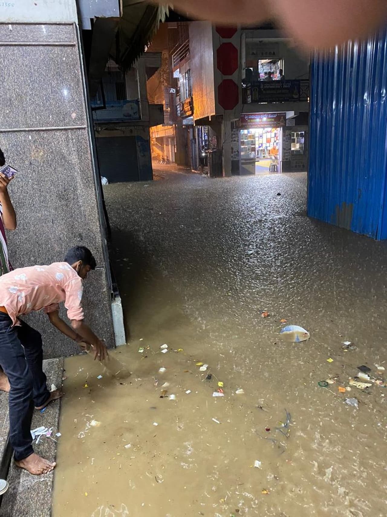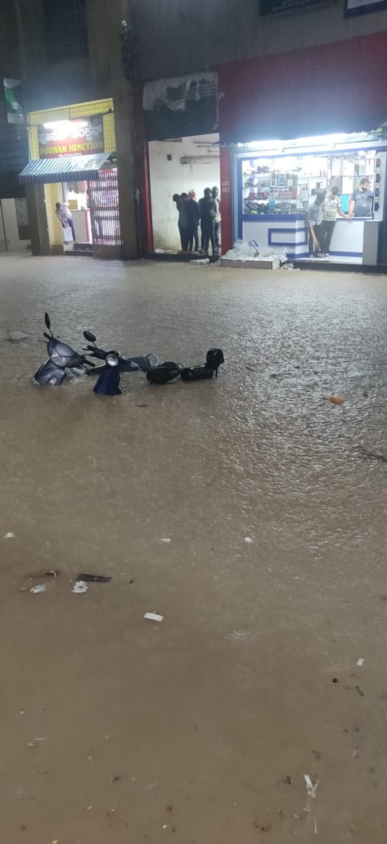 Roads in market areas like Chickpet and Sultanpet were completely submerged and shops were partially submerged with rain and drainage water.