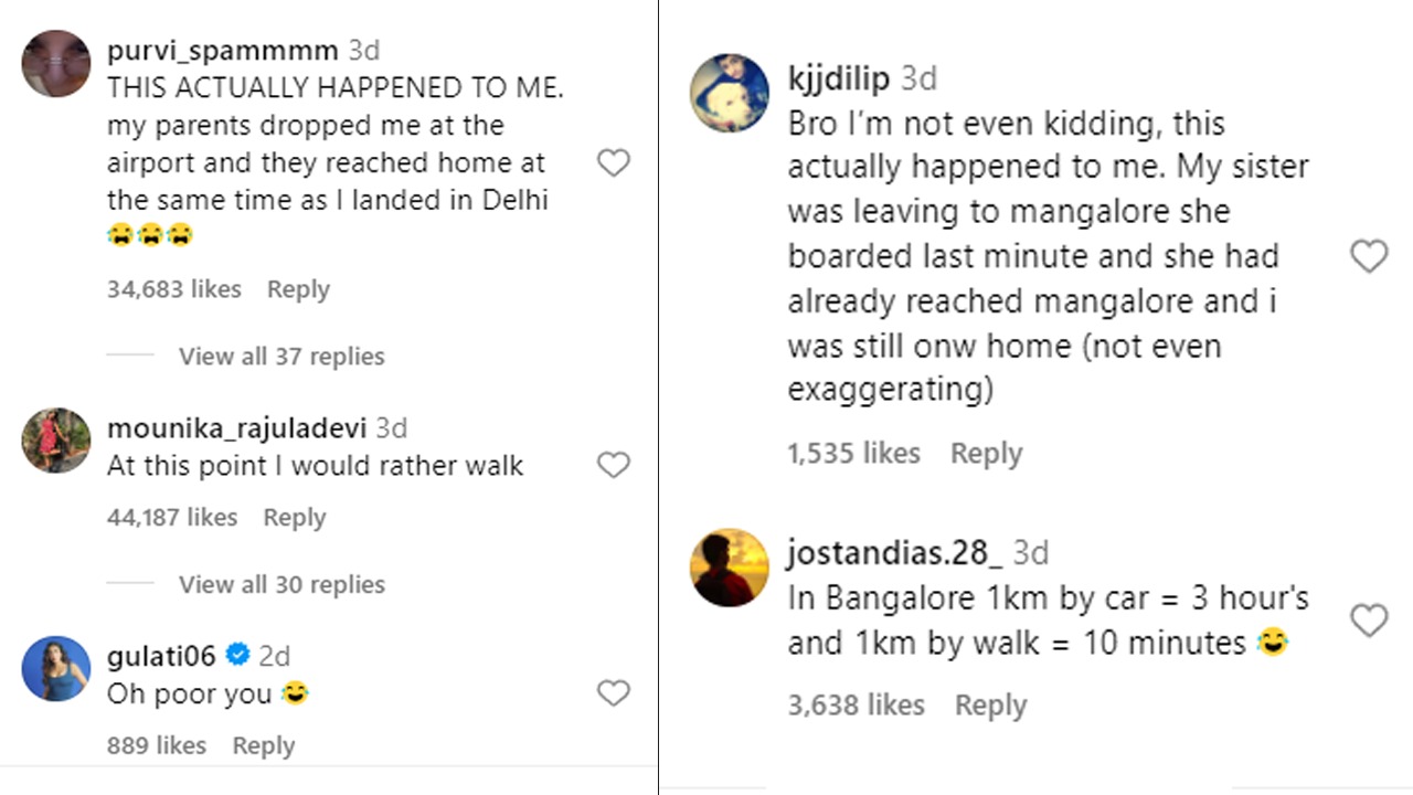 People on social media poured their own tales of traffic mayhem into the comments section. “I genuinely experienced this. My parents dropped me off at the airport and got home at the same time I landed in Delhi,” one user said.