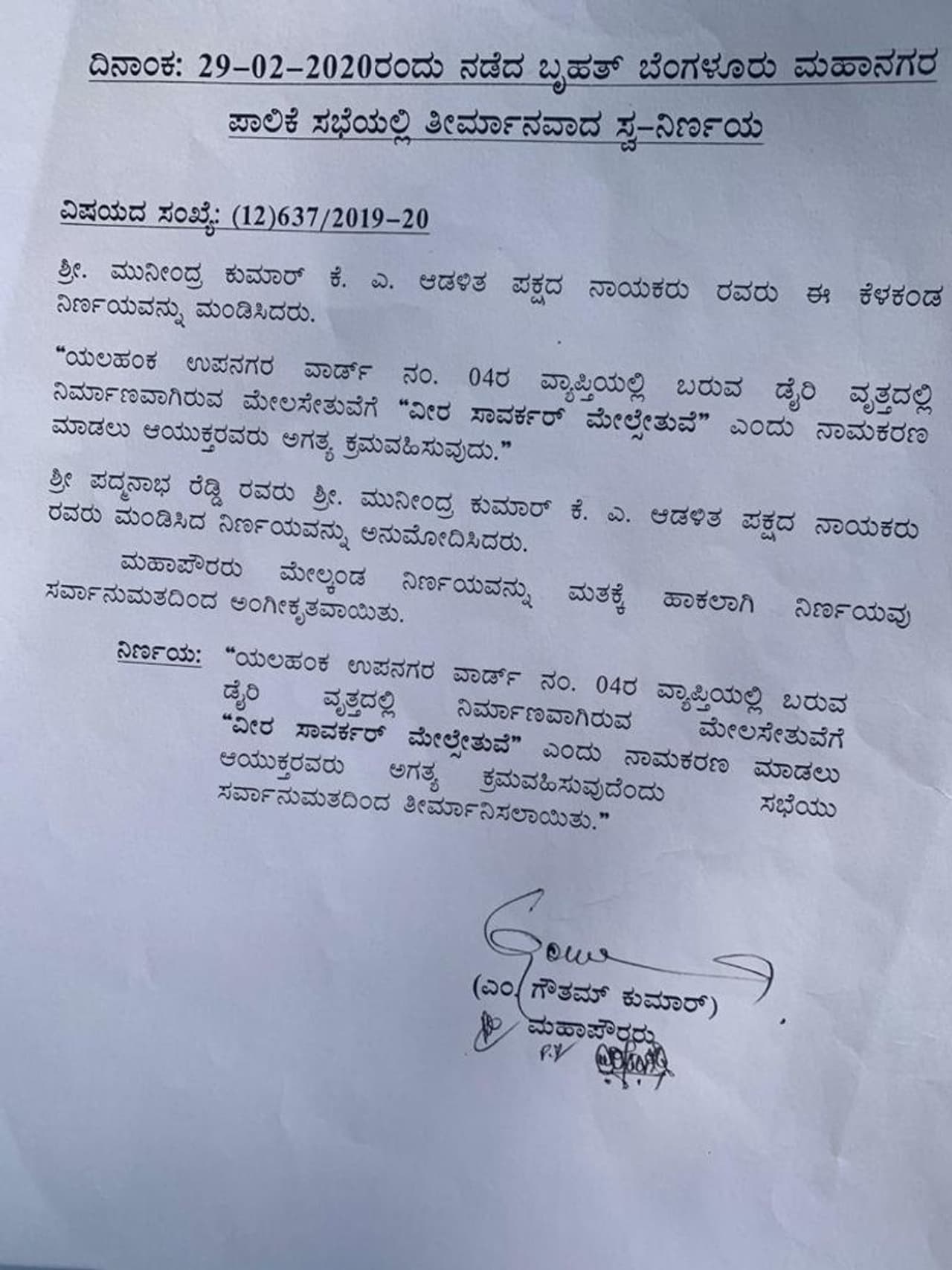 "The construction of the flyover started three years ago and for the last two months, we have been trying to procure permission to name the flyover after Veer Savarkar. After suggestions from people, our corporator filed a proposal with the BBMP. The palike has granted us permission to name the flyover after Savarkar," said Vishwanath.