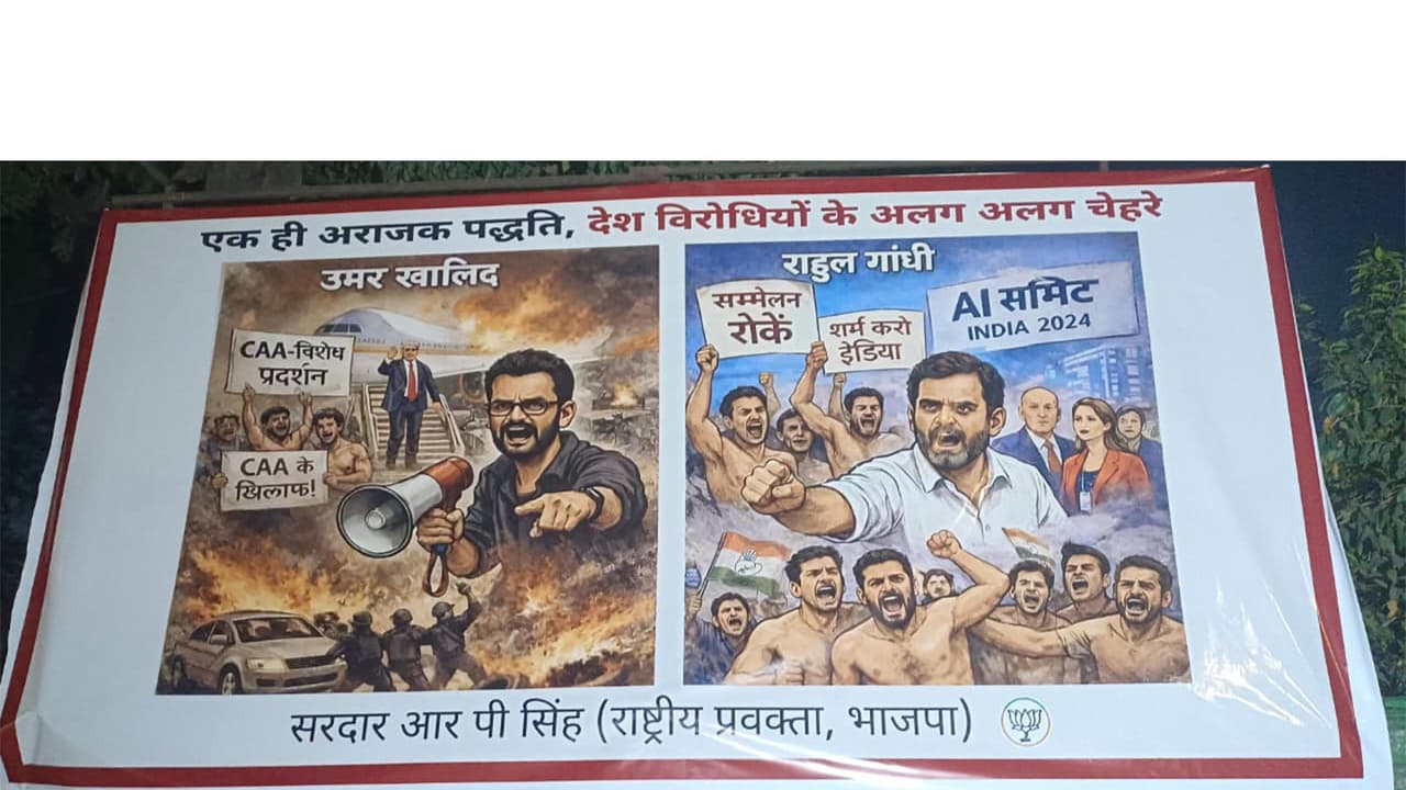 Amid a war of words between the BJP and Congress over "shirtless protest" by IYC workers at AI Impact Summit, BJP leader RP Singh on Wednesday targeted Rahul Gandhi with a poster ostensibly comparing him with 2020 Delhi riots accused Umar Khalid with the slogan "different faces of anti-nationals".