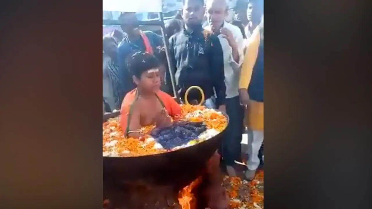 In the video, a little boy with folded hands can be seen calmly sitting in a huge vessel placed on fire.