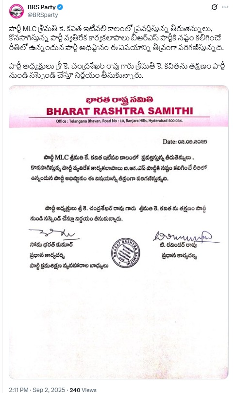 BRS tweeted, "The party leadership is taking this matter seriously as the recent behavior and ongoing anti-party activities of party MLC K. Kavitha are damaging the BRS party. Party President K. Chandrasekhar Rao has taken a decision to suspend K. Kavitha from the party with immediate effect."