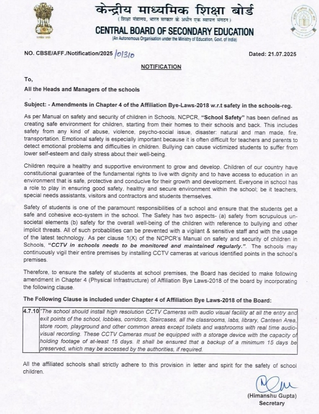 The Central Board of Secondary Education (CBSE) has made a new rule to improve student safety. From now on, all schools under CBSE must install high-quality CCTV cameras with audio-visual recording. These cameras must be placed at all key points in the school such as entrances, classrooms, corridors, and playgrounds.