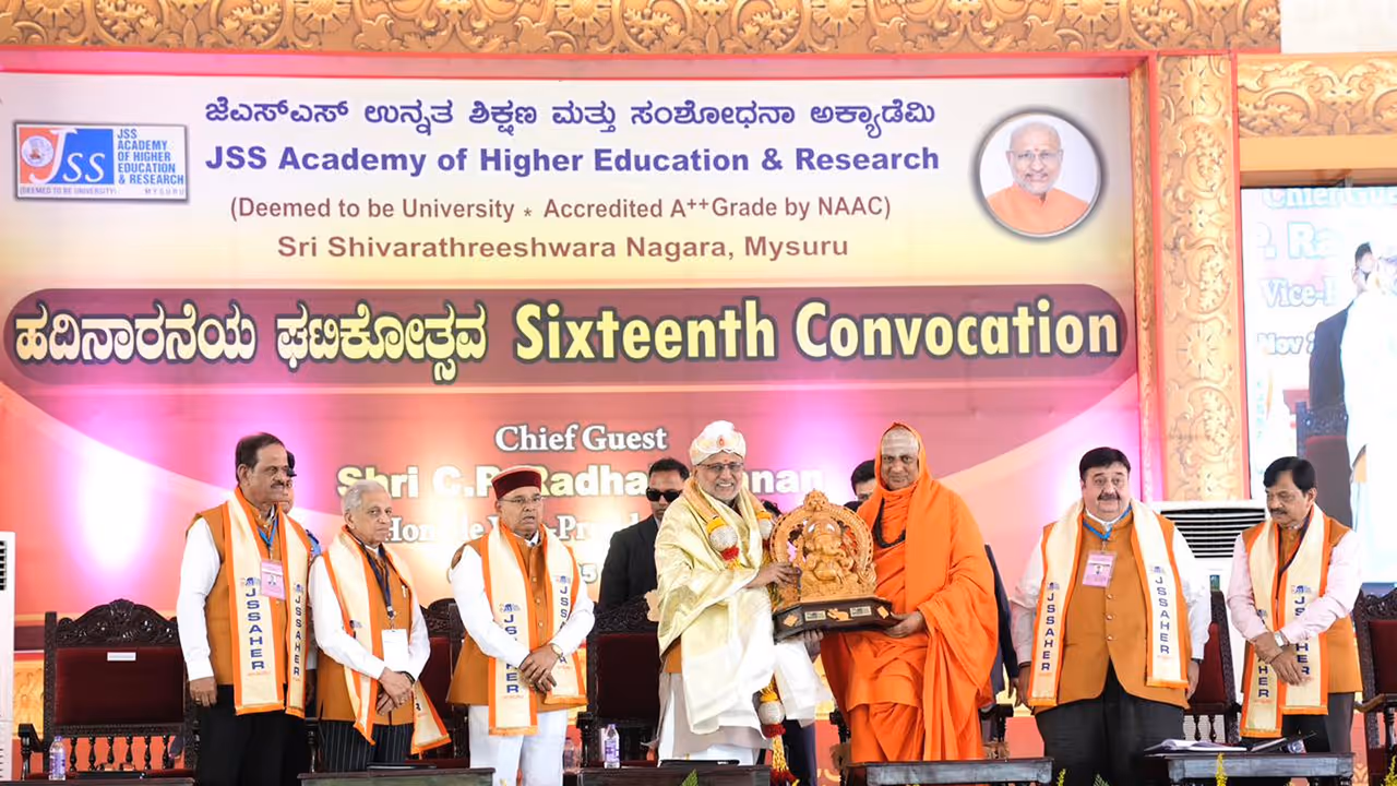 Vice President CP Radhakrishnan graced the 16th Convocation Ceremony of JSS Academy of Higher Education & Research (JSS AHER) held today at Sri Shivarathreeshwara Nagara, Mysuru. In his convocation address, the Vice-President underscored the importance of consistency as the key to success, urging each graduate to recognise their unique talents and set personal goals aligned with their own rhythm of achievement.