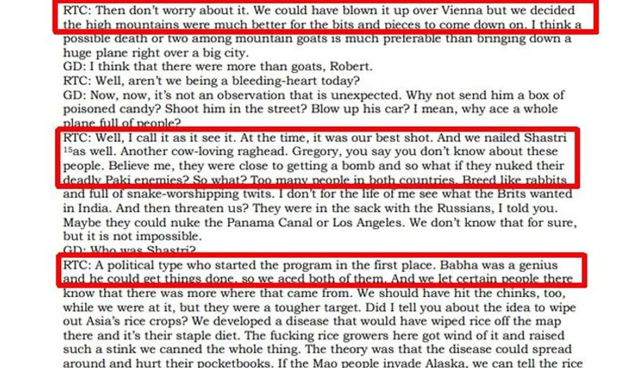 The conspiracy starts unravelling when he narrates how a bomb went off in the cargo hold of the Boeing 707 Air India aircraft in which Bhabha was travelling to Vienna. This contradicts the official version that blamed a pilot error for the aircraft's crash.