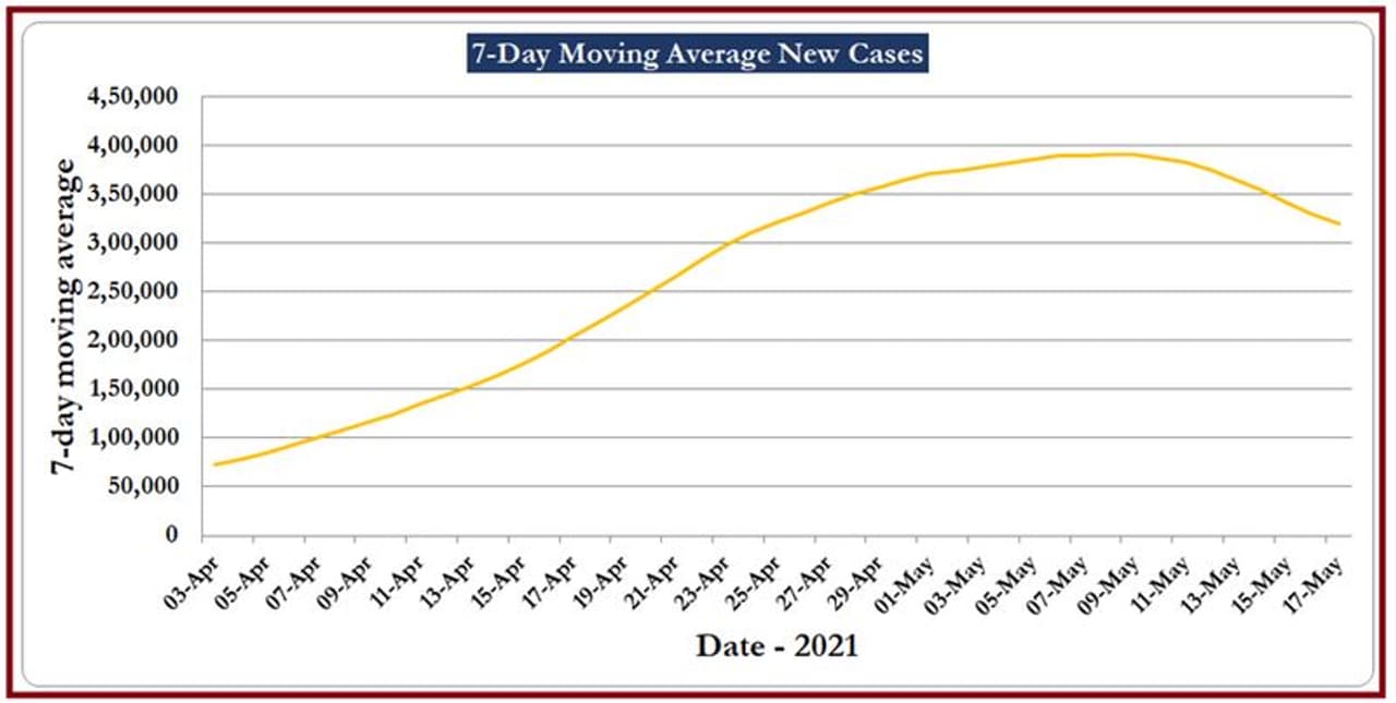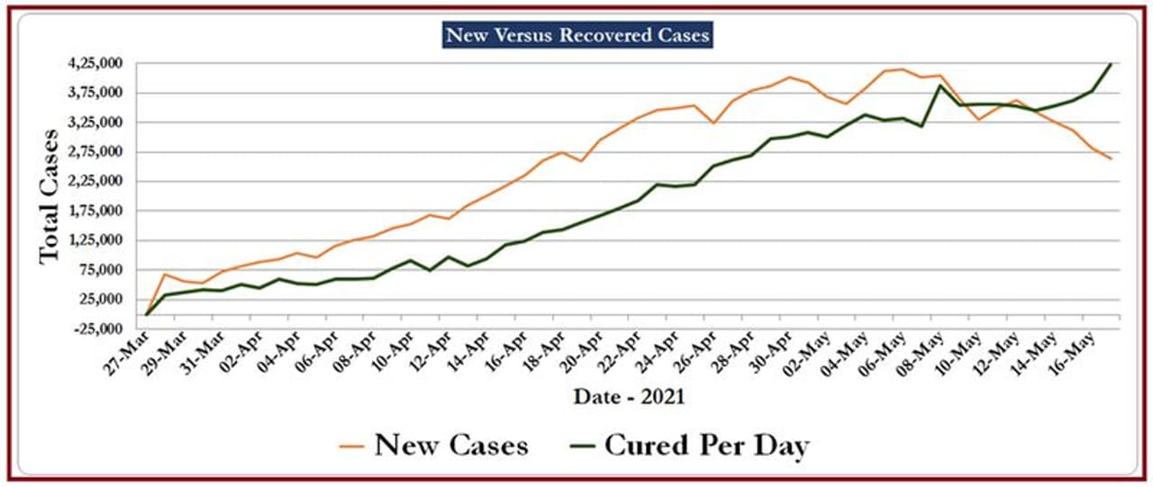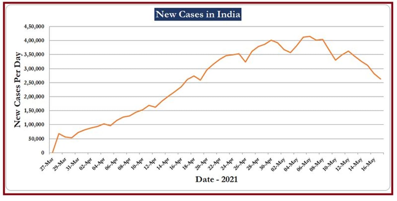 After some harrowing weeks, a glimmer of hope maybe finally emerging in India’s war against the second wave of the COVID-19 pandemic. The graph of daily new cases (Graph 01) as well as the more reliable graph of seven-day moving average of new cases (Graph 02) is now showing a sustained dip. The new cases versus recoveries graph (Graph 03) is also now in the green with daily recoveries now overshooting the new cases.