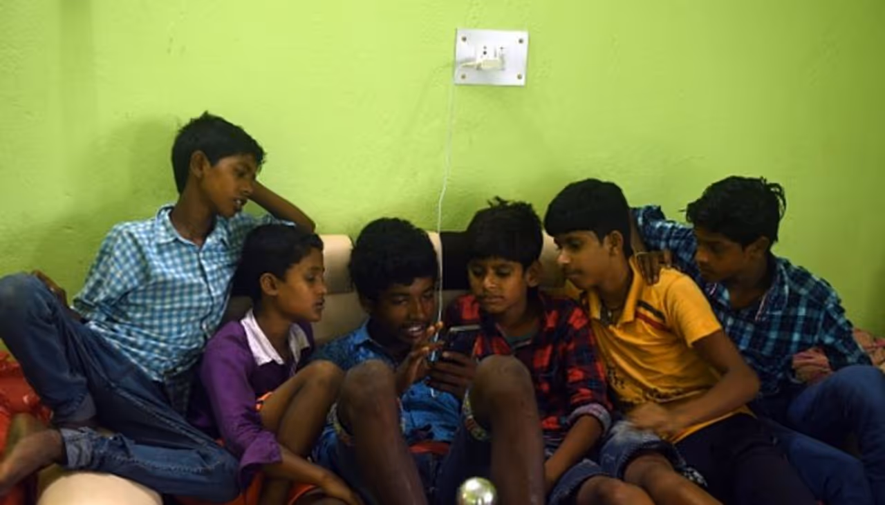 Youths play a game on a mobile phone at a shelter ahead of the expected landfall of Cyclone Amphan, in Tajpur of East Midnapore district in West Bengal, on May 20