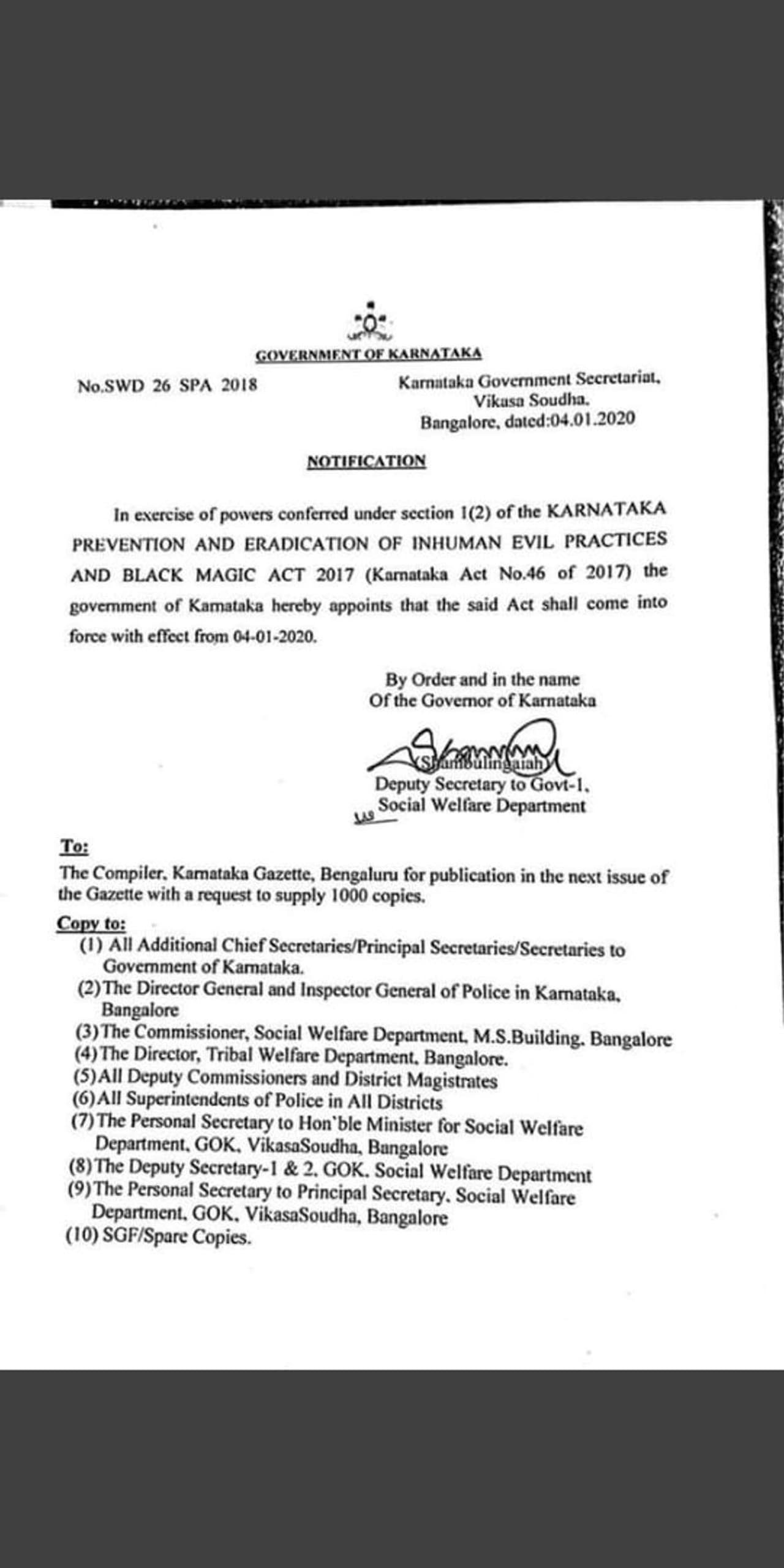 This bill was passed by both houses of the state legislature in 2017 when Siddaramaiah-led Congress government was in office. Earlier this month, Governor Vajubhai Rudabhai Vala gave his assent to the bill.