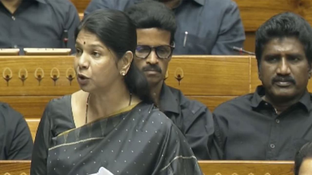 Addressing the Lok Sabha while adorning a black saree in protest, Kanimozhi criticised the Centre's move to notify the Nari Shakti Vandan Adhiniyam, 2023, in the Gazette last night, when one-third reservation for women legislators is being discussed in Parliament. The DMK MP said, "I not only stand as a representative of the Dravida Munnetra Kazhagam, but also eight crore people who have been told amidst the elections that their votes will count less and their voice in this Parliament will be diminished. It is really shocking. We are discussing the Bill here, so what was the need to notify it yesterday? What is the respect you have for this House? These three bills are disguised as if they are in support of reservation for women, constitute the single greatest assault on federal structure."