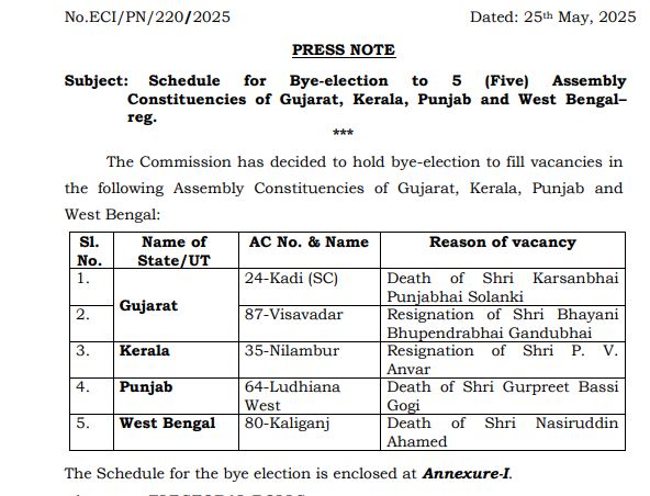 The Election Commission of India has announced the dates for bye-elections in 5 assembly constituencies across Gujarat, Kerala, Punjab, and West Bengal. Voting will take place on June 19, with results declared on June 23.