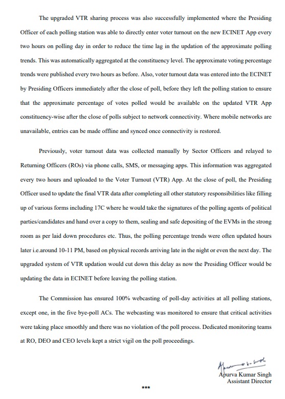 Another major reform was the upgraded Voter Turnout Reporting (VTR) system. Previously, turnout data was collected manually and uploaded late in the evening. Now, Presiding Officers directly entered turnout data every two hours using the ECINET app. This change: