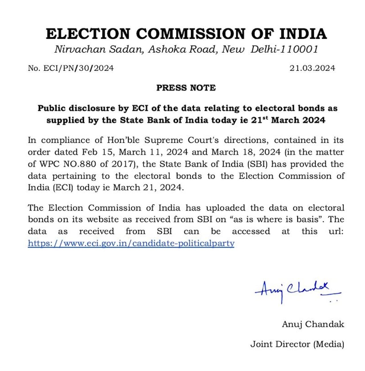 The Election Commission of India (ECI) has published the electoral bonds data including the bond numbers as released by the State Bank of India (SBI) – in line with the Supreme Court’s directions. You can access the details by clicking: https://www.eci.gov.in/disclosure-of-electoral-bonds
