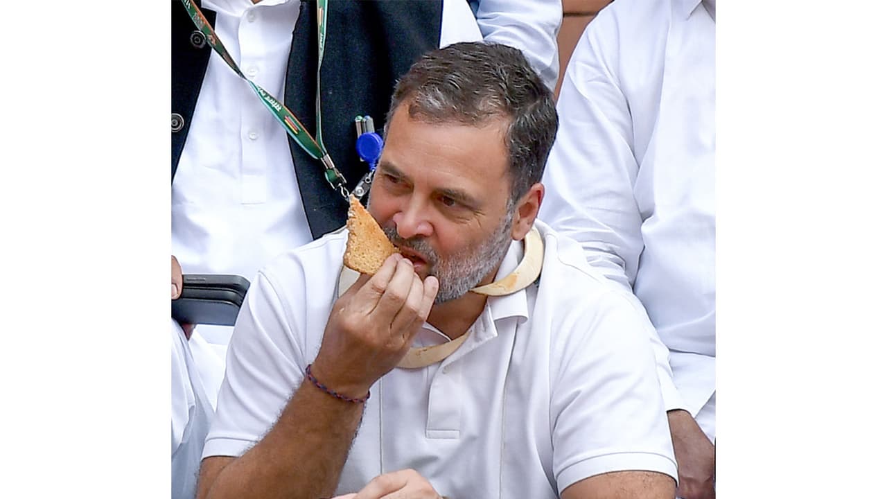 On March 12, Rahul Gandhi joined a protest at the Makar Dwar entrance to Parliament. Photos and videos went viral showing him casually sharing tea and snacks with colleagues. BJP MP Nishikant Dubey has submitted a notice to the Lok Sabha Speaker along with a pen drive containing material related to the incident, stating that such actions "lowered the dignity" of the Parliament. (ANI)