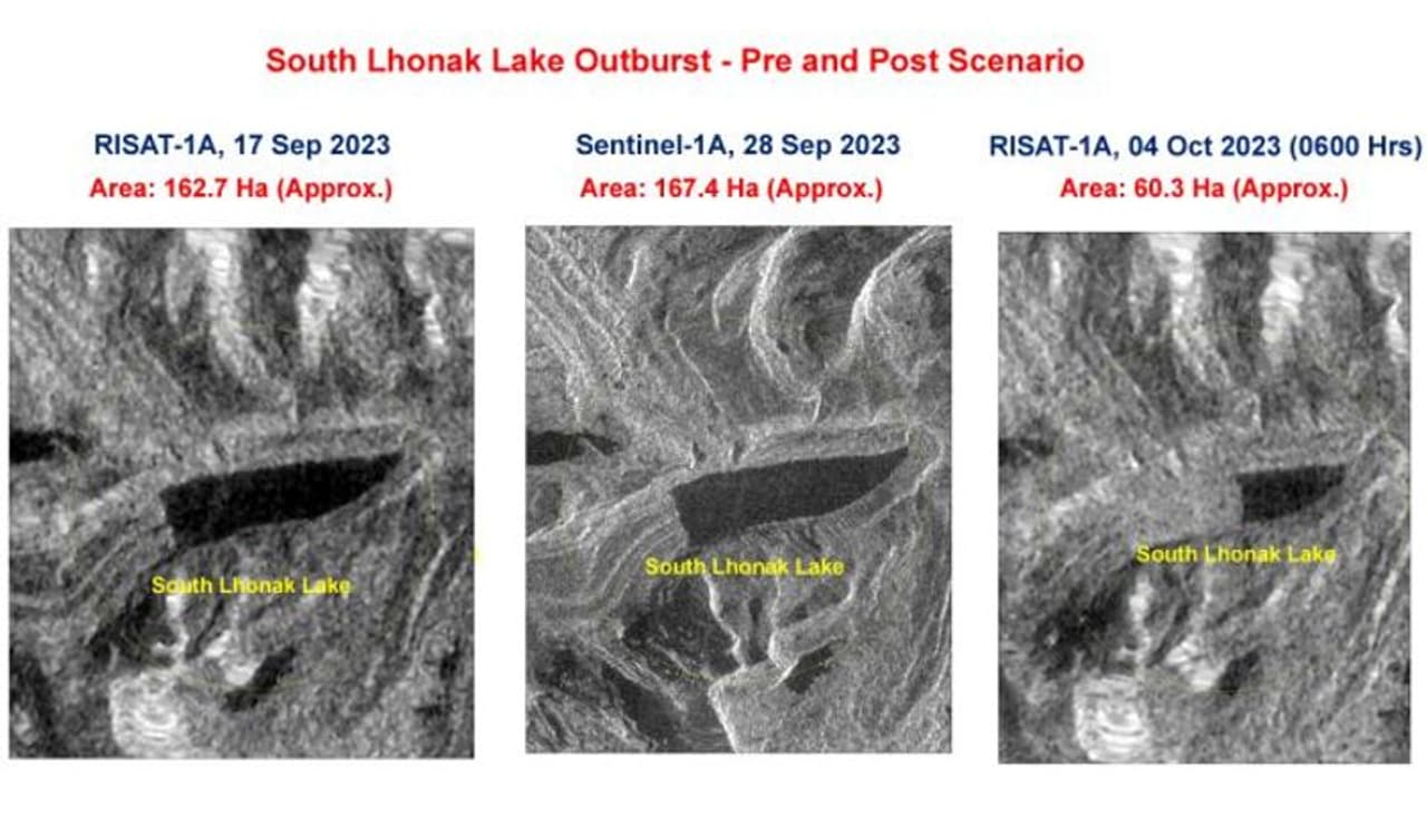South Lhonak Lake is situated at an elevation of 5,200 meters, with a towering ice-capped feature reaching approximately 6,800 meters north of the lake. Satellite imagery received from the National Remote Sensing Centre (NRSC) of the Indian Space Research Organisation (ISRO) at 0600 hrs on Wednesday has indicated the draining of over half the lake.