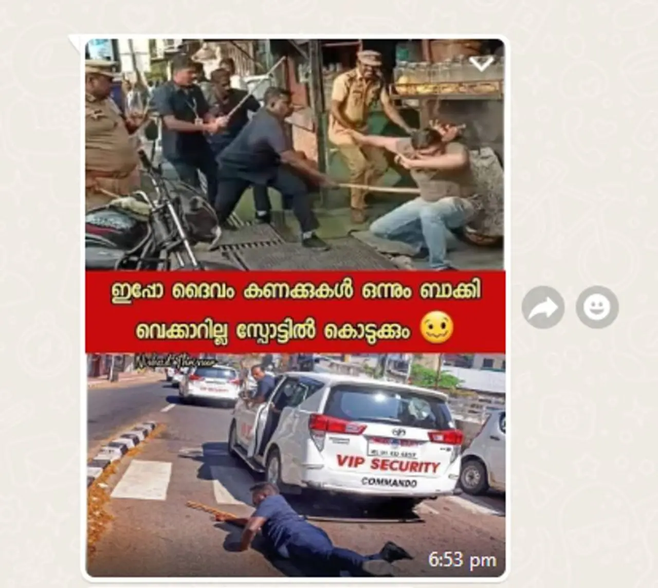 A picture of Chief Minister Pinarayi Vijayan's gunman tripping and falling on the road during the Nava Kerala Sadas is being widely circulated on Facebook and WhatsApp. This photo is being circulated on WhatsApp with the caption 'Now God does not leave any figures, He will give them on the spot'. In the picture, the gunman who beat the Youth Congress workers who protested against the Chief Minister's Nava Kerala Sadas is seen lying down.
