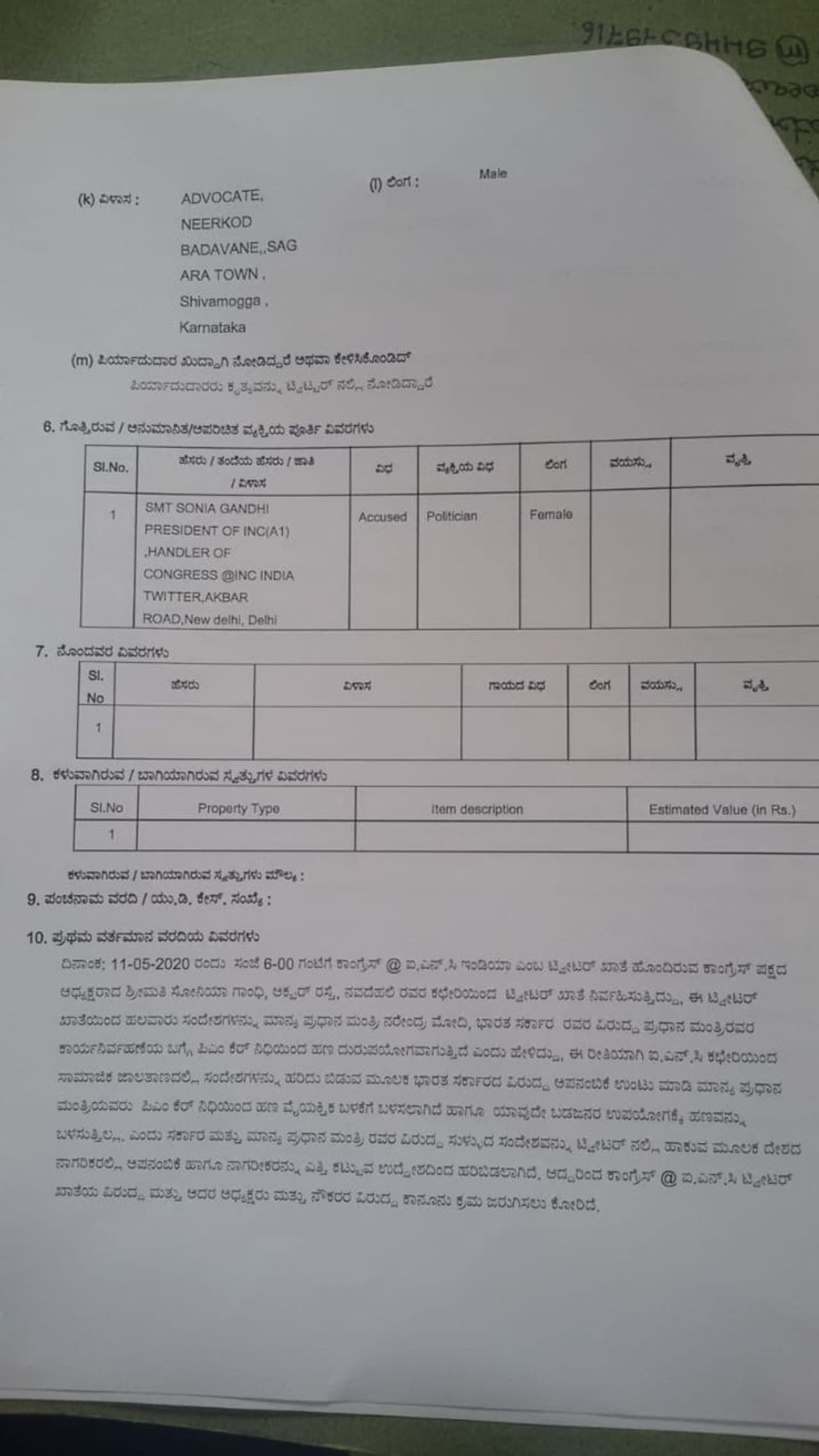 "Indian National Congress has tweeted 5-6 tweets from their handle @INCIndia on May 11th. The tweets allege that PM Modi is misusing the money contributed to PM-CARES Fund and is utilising it for personal use. They have termed it as "PM Cares Fraud". They have spoken ill about the PM, the country and the people of the country. I have filed a complaint at Sagar Police Station in this regard. A FIR has been registered against Congress chief Sonia Gandhi and investigation is underway," said Praveen.