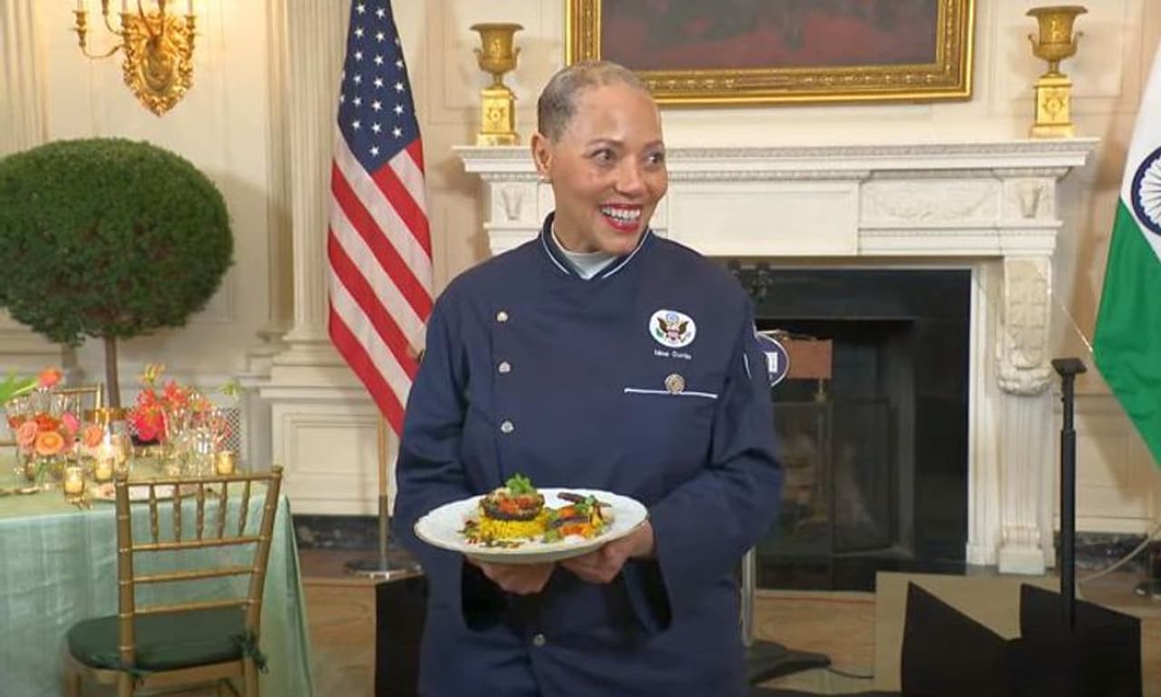 Nina Curtis, a plant-based chef from Sacramento, California. She will be working alongside White House Executive Chef Cris Comerford, and White House Executive Pastry Chef Susie Morrison to develop the menu. Chef Nina Curtis, who will be developing the vegetarian menu for the State Dinner, said: "This is definitely a pinnacle moment of my career. We have curated a menu that really showcases the best in American cuisine, and is also seasoned with Indian elements and flavours."
