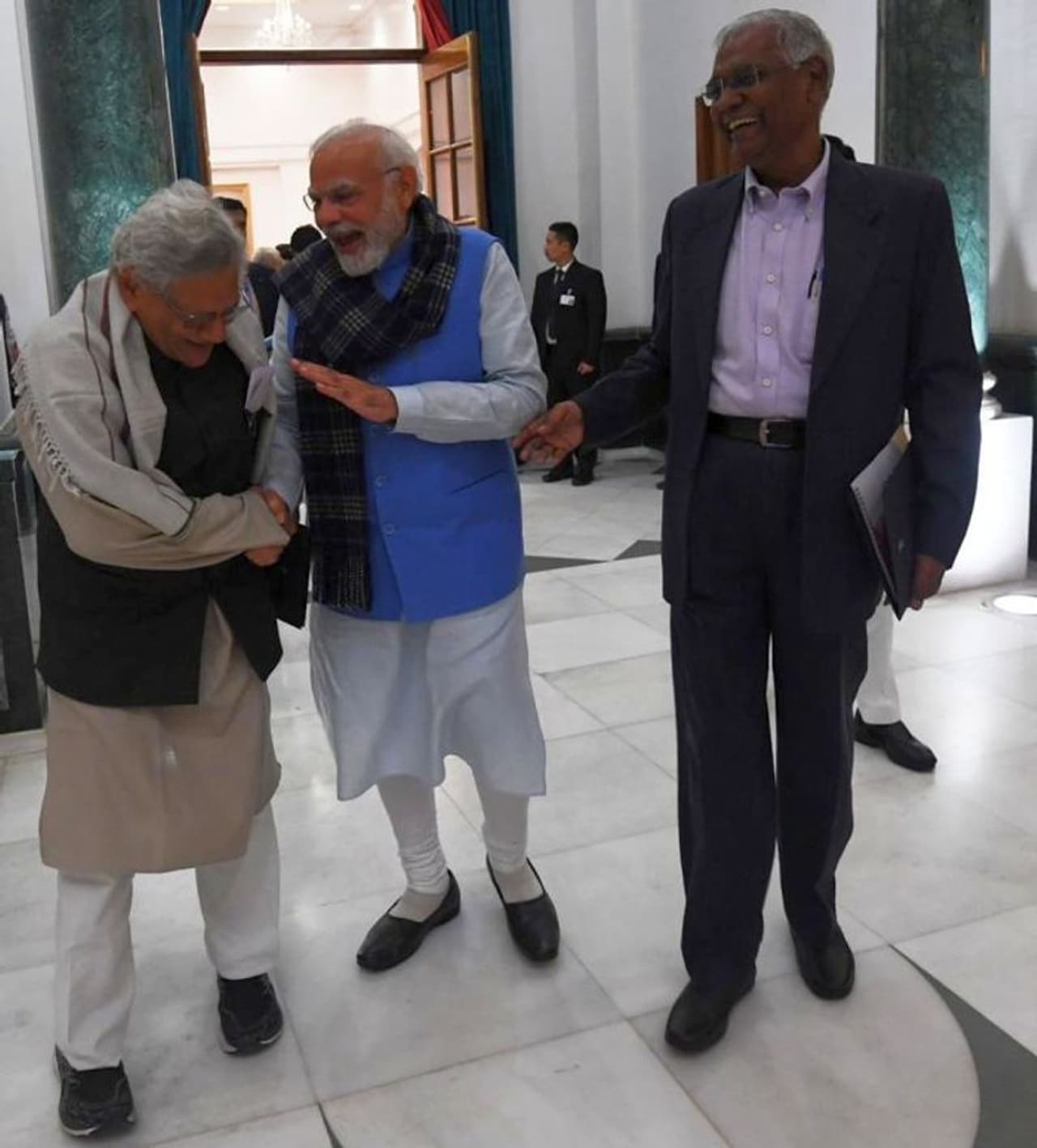 LEFT-RIGHT-LEFT: The first one shows CPM General Secretary Sitaram Yechury and CPI General Secretary D Raja sharing an absolute light moment with Prime Minister Narendra Modi.