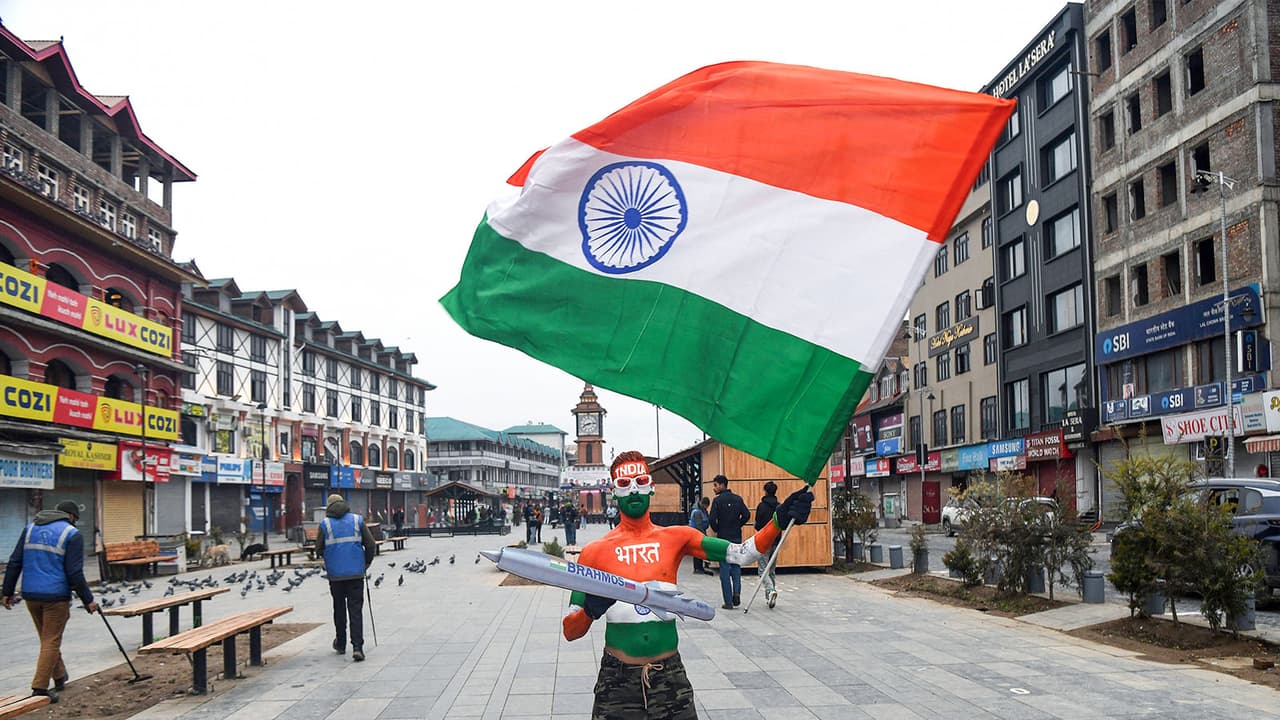 A tourist from Gujarat's Ahmedabad, painted himself in colours of the Tricolour, carried a mini model of BrahMos, and waved the National Flag with chants of 'Bharat Mata ki jai' as he celebrated the 77th Republic Day at the iconic Ghanta Ghar at Lal Chowk in Srinagar.
