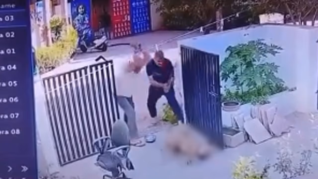CCTV footage from Rajkot, Gujarat, shows two men brutally beating a tied dog with sticks near Madhapar Chokdi. A police complaint has been filed, and the injured dog is now stable after receiving care. The viral video has sparked widespread outrage on social media, with users demanding strict action against the perpetrators.