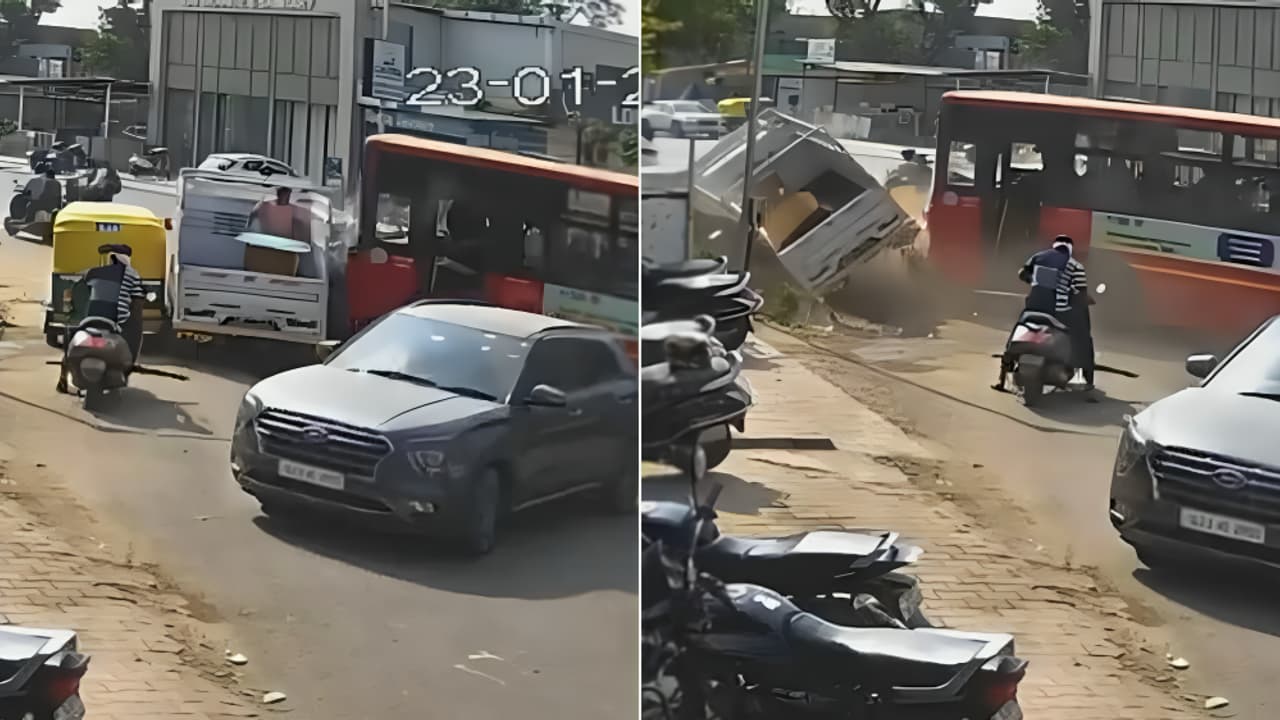 A CCTV video showed an AMTS bus causing a triple collision near Ahmedabad's Gota Ceramic Market after hitting a school van, a tempo and an autorickshaw. The tempo overturned, but no serious injuries were reported and children in school van were safe.