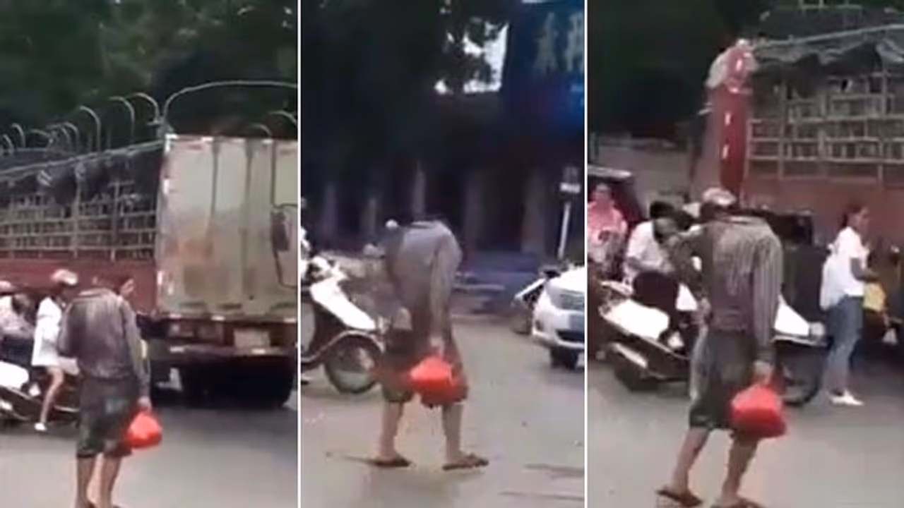 On a busy street with vehicles plying, a man without a head seems to have caught people by surprise. The man is seen wearing shorts and sporting a shirt, while carrying a red bag. What's shocking is that even though the man is without a head, he walks without a care in the world on the road that is traffic prone. Even commuters seem to be 'cool headed' upon seeing the headless man.