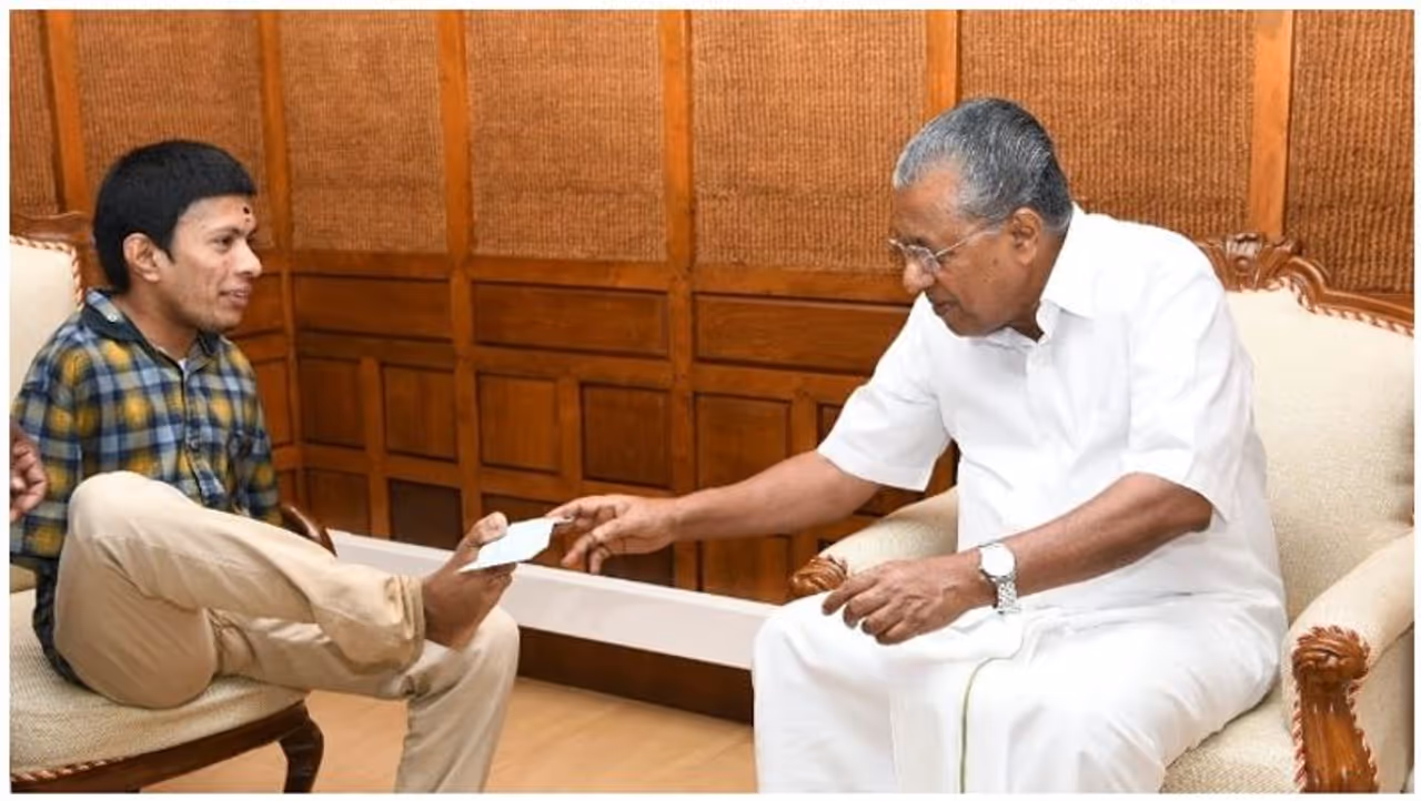 The painter, who was born without arms, excels in painting with his foot. He had signed the cheque with his toes. In his Twitter post, Vijayan also said that Pranav "expressed happiness over the support given by the government for differently-abled persons."