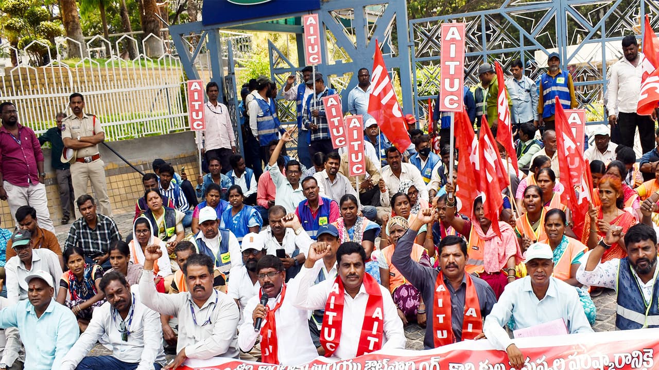 The All India Trade Union Congress (AITUC) protested at the GHMC office in Hyderabad for 50,000 contract workers. The union demands a minimum wage of Rs 26,000, leave benefits, and a bonus, citing stagnant wages and rising prices.