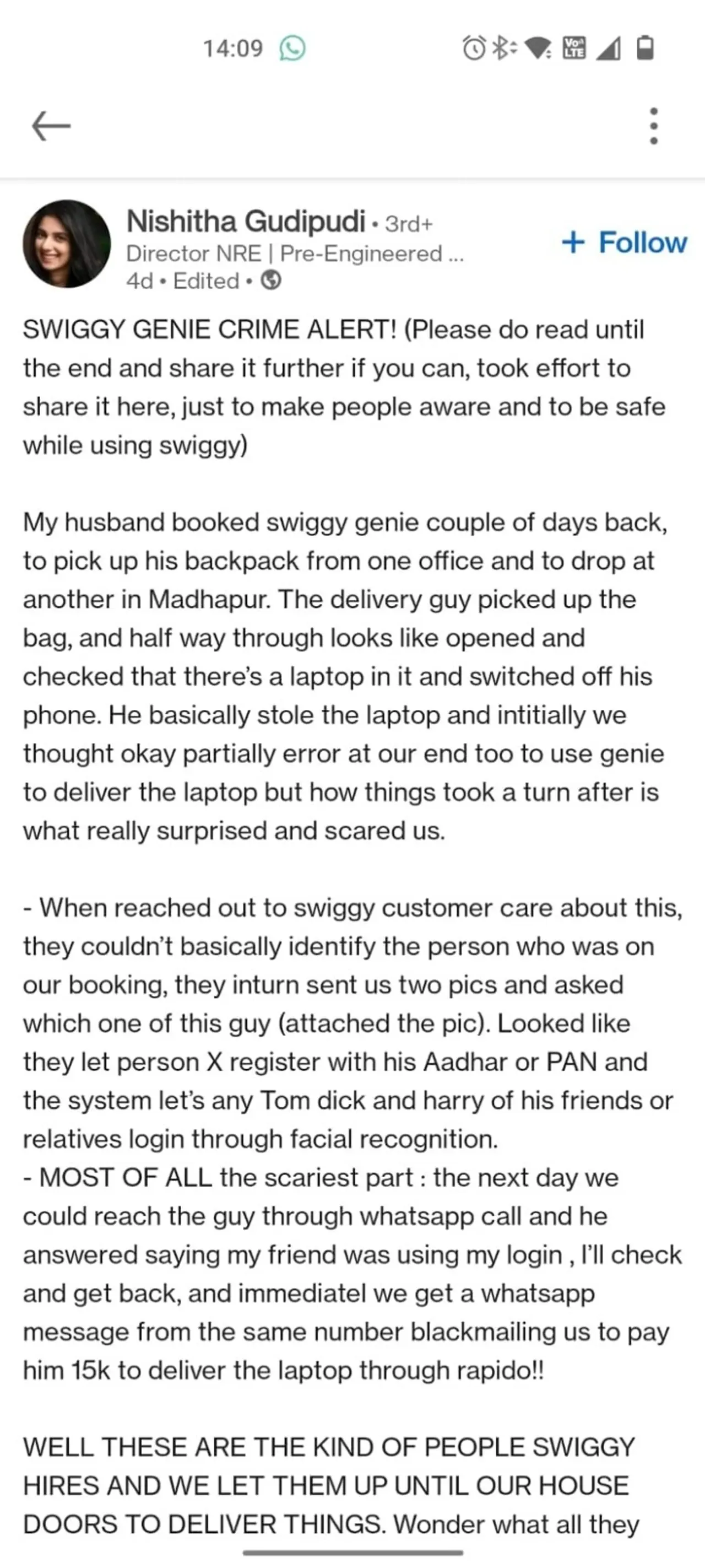 Gudipudi took to LinkedIn to share this troubling incident. She said that her husband had enlisted the Swiggy Genie service to transport his backpack from one office to another in Madhapur. According to Gudipudi, the delivery agent, upon picking up the backpack, surreptitiously rifled through it. Discovering the laptop inside, the agent allegedly switched off his phone and vanished, never to return the stolen device.