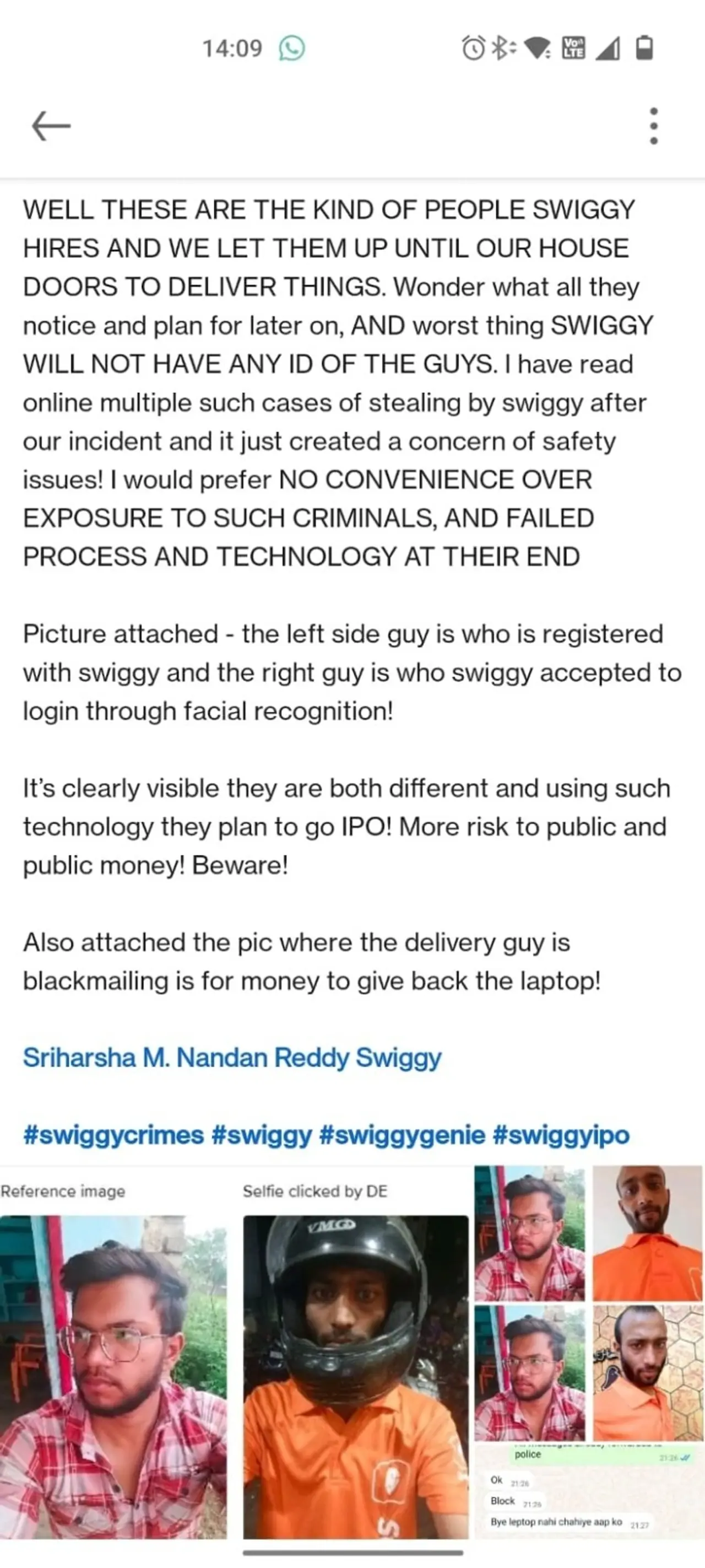 Gudipudi’s post is replete with damning evidence, including photographs of the delivery agent and an accomplice, alongside a screenshot of a WhatsApp conversation with the accused agent, demanding a ransom for the laptop's return.