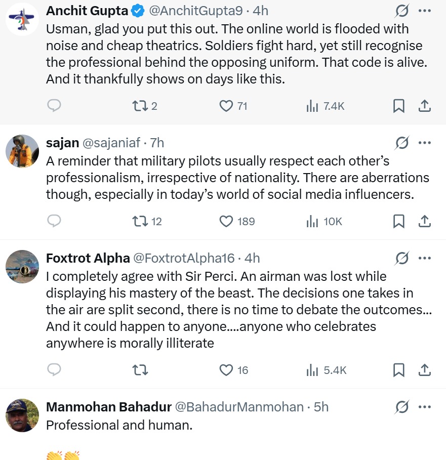 Many users on X responded with appreciation for the calm and dignified message posted by PAF veteran Wg Cdr Perci Virji. One user wrote that despite online ‘noise and cheap theatrics’, real soldiers always honour professionalism across borders. Another commentator said military pilots respect each other regardless of nationality. Another user added that celebrating any pilot’s death is “moral illiteracy,” while Manmohan Bahadur called the veteran’s words “professional and human.”
