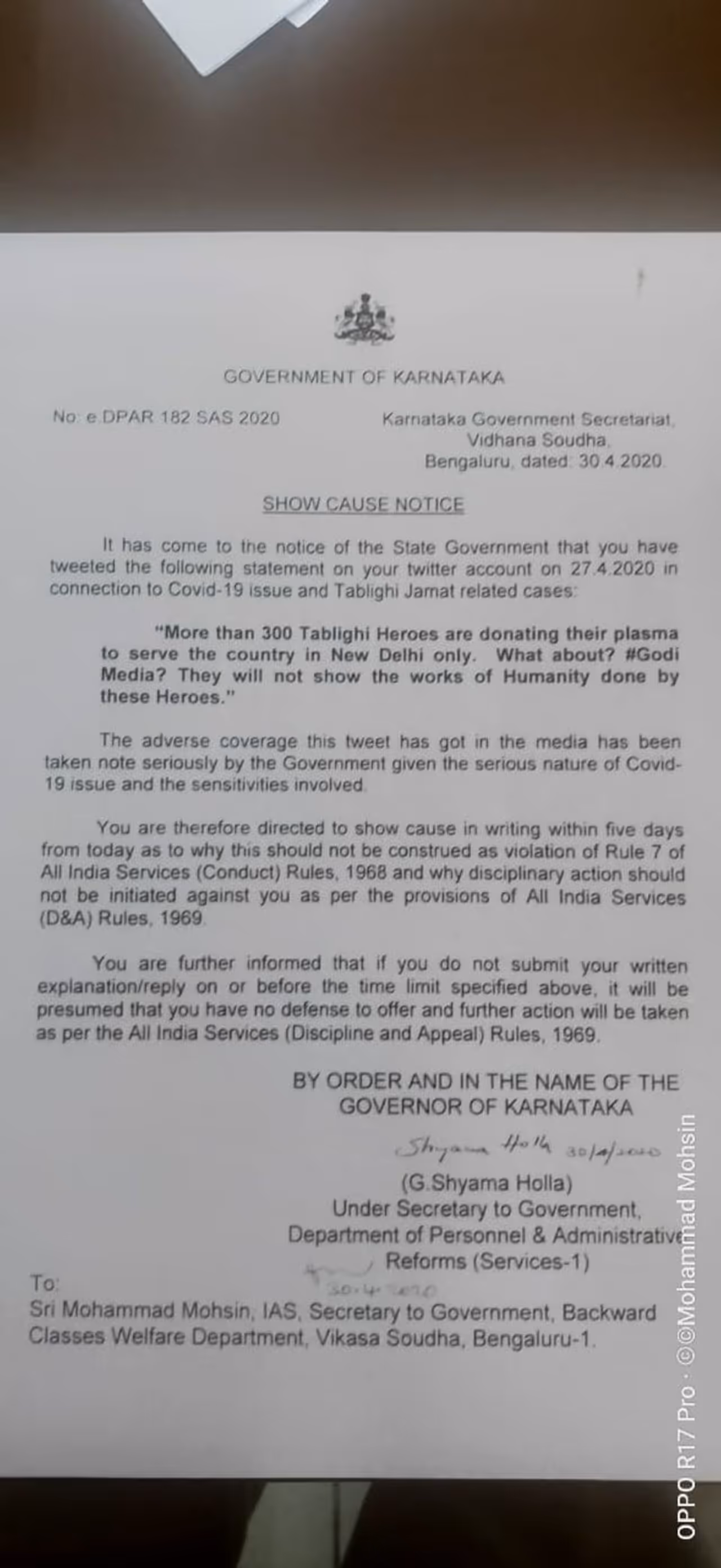 Bengaluru: The Karnataka government on Friday issued a show-cause notice to an IAS officer over his recent tweet eulogising coronavirus-cured Tablighi Jamaat members for donating plasma for treatment of other patients.