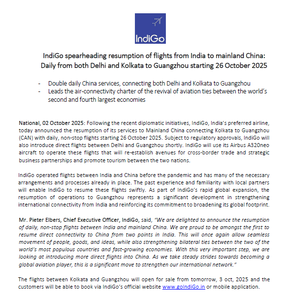 India and China have agreed to resume direct air services between the two countries starting late October 2025, following recent diplomatic talks and civil aviation discussions. The Ministry of External Affairs announced the decision, highlighting it as a significant step toward the gradual normalization of bilateral relations, easing travel for business, tourism, and people-to-people exchanges. Following the diplomatic progress, IndiGo announced it will operate daily non-stop flights from Kolkata to Guangzhou (CAN) using Airbus A320neo aircraft starting October 26, further easing travel and strengthening people-to-people and business ties. Air India is also likely to resume flight services to China by the end of the year.