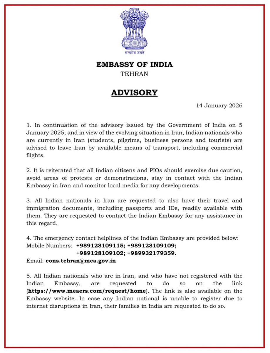 The Government of India has asked all Indian nationals currently in Iran to leave the country as soon as possible. The advisory was issued by the Indian Embassy in Tehran on January 14, 2026, citing the evolving and uncertain situation in Iran.