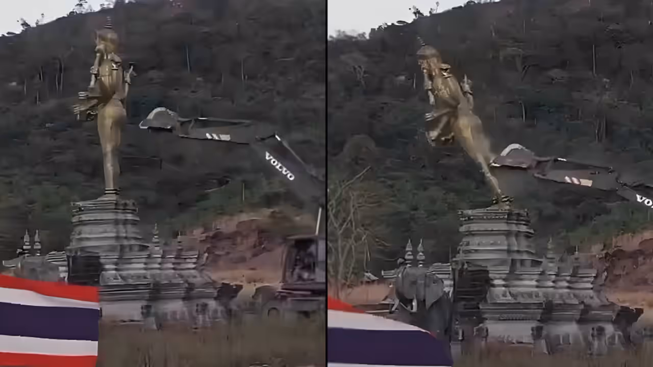 Videos showing the demolition of the Vishnu statue using a back-hoe loader began circulating widely on Thai social media and local media platforms on Monday.