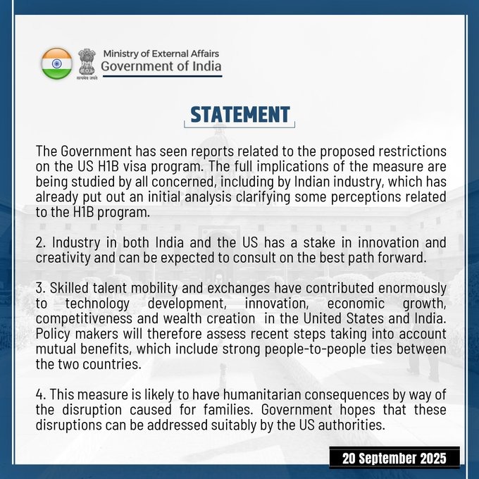 The Ministry of External Affairs (MEA) issued a statement expressing that the full implications of the new H-1B visa fee are being studied. The MEA highlighted that skilled talent mobility has significantly contributed to technology development, innovation, economic growth, competitiveness and wealth creation in both the United States and India. The government emphasised that policymakers should assess recent steps considering mutual benefits, including strong people-to-people ties between the two countries.