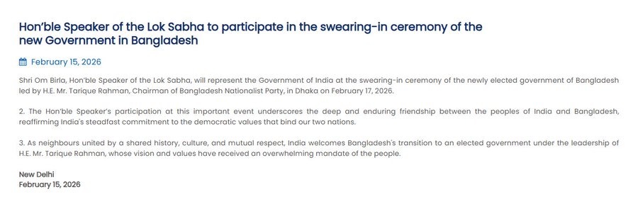 Ministry of External Affairs in a statement said that India will be represented by Om Birla at the swearing-in ceremony of the newly elected government of Bangladesh led by Tarique Rahman in Dhaka on February 17, 2026. The government said Birla’s participation reflects the deep and enduring friendship between India and Bangladesh and reaffirms India’s support for democratic values and closer bilateral ties. The statement read: