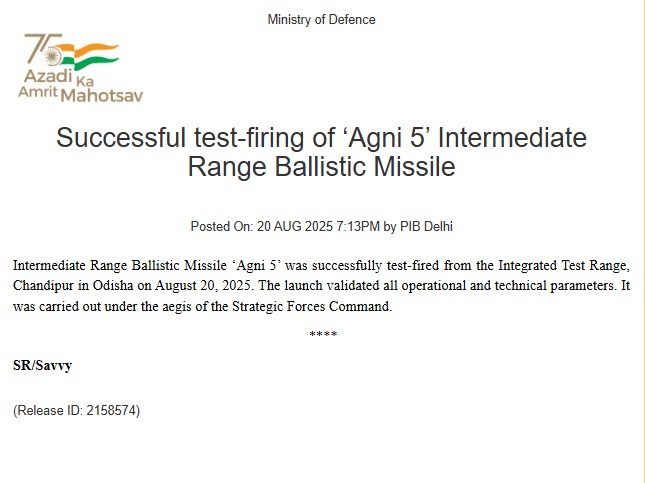Defence Ministry has said that India successfully test-fired the intermediate-range ballistic missile Agni-5 from the Integrated Test Range at Chandipur, Odisha, on August 20, 2025. Conducted under the Strategic Forces Command, the launch validated all key operational and technical parameters, the Ministry of Defence added