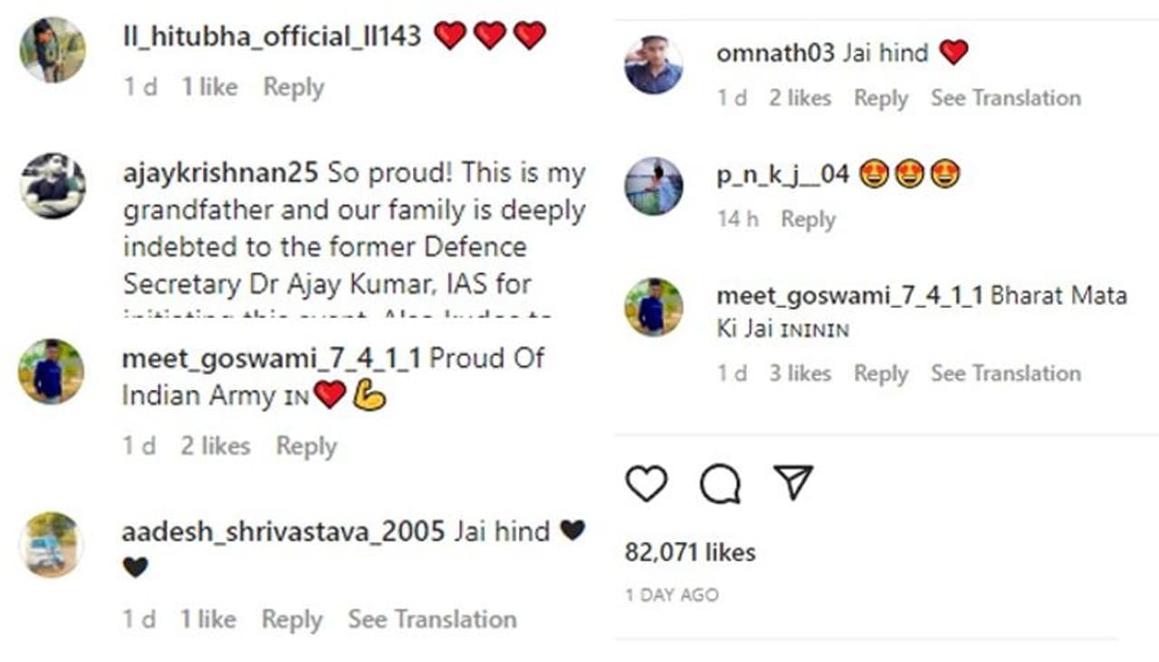 It has received many comments and 81,000 likes. The grandson of the soldier also left a comment on the image, stating, "So pleased! This is my grandpa, and our family owes Dr. Ajay Kumar, IAS, the former secretary of defence, a great debt of gratitude for organising this gathering. ASC Trivandrum deserves praise as well for organising the event at the unit level!"