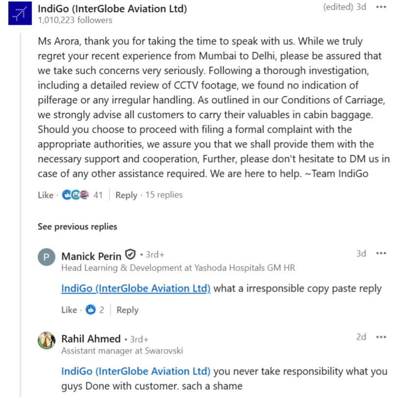 Many on Arora's LinkedIn post slammed IndiGo for the 'copy-paste reply' and 'shameful irresponsibility'. Arora also questioned the response from the Airline, responding: