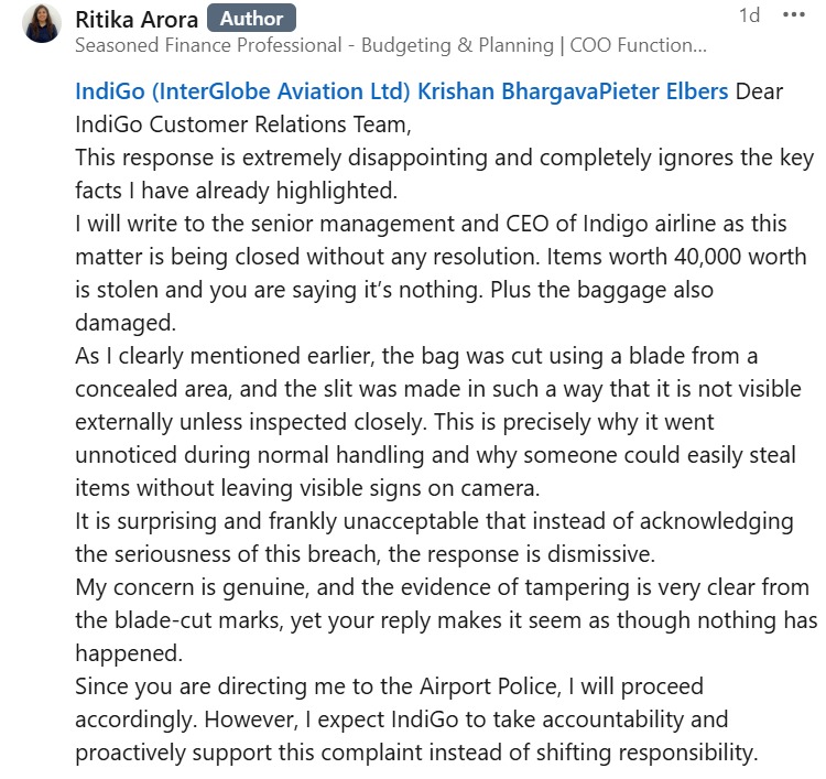 The passenger, Ritika Arora, shared her experience in a detailed LinkedIn post that has since gone viral. She wrote that during her recent Mumbai-Delhi IndiGo flight, both of her checked-in suitcases were “cut open, tampered with” and valuable items were missing.