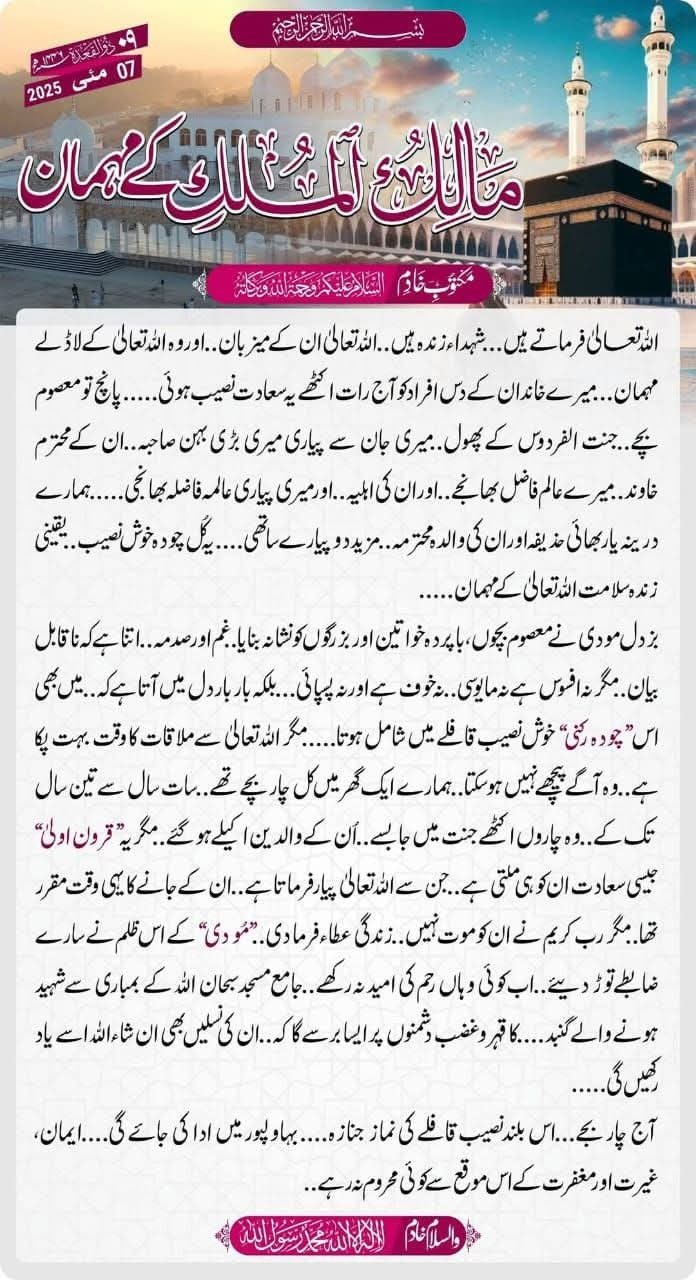 “My beloved sister (may Allah elevate her ranks) and my brother-in-law, the esteemed Hafiz Sahib... my nephews and nieces, the beloved children of my sister and brother-in-law... the mother of our beloved brother Hafiz Iftikhar, the mother of two martyrs... may their graves be filled with light... such an enviable and joyous destiny... truly, they are the living guests of Allah," read the loosely translated Urdu statement.