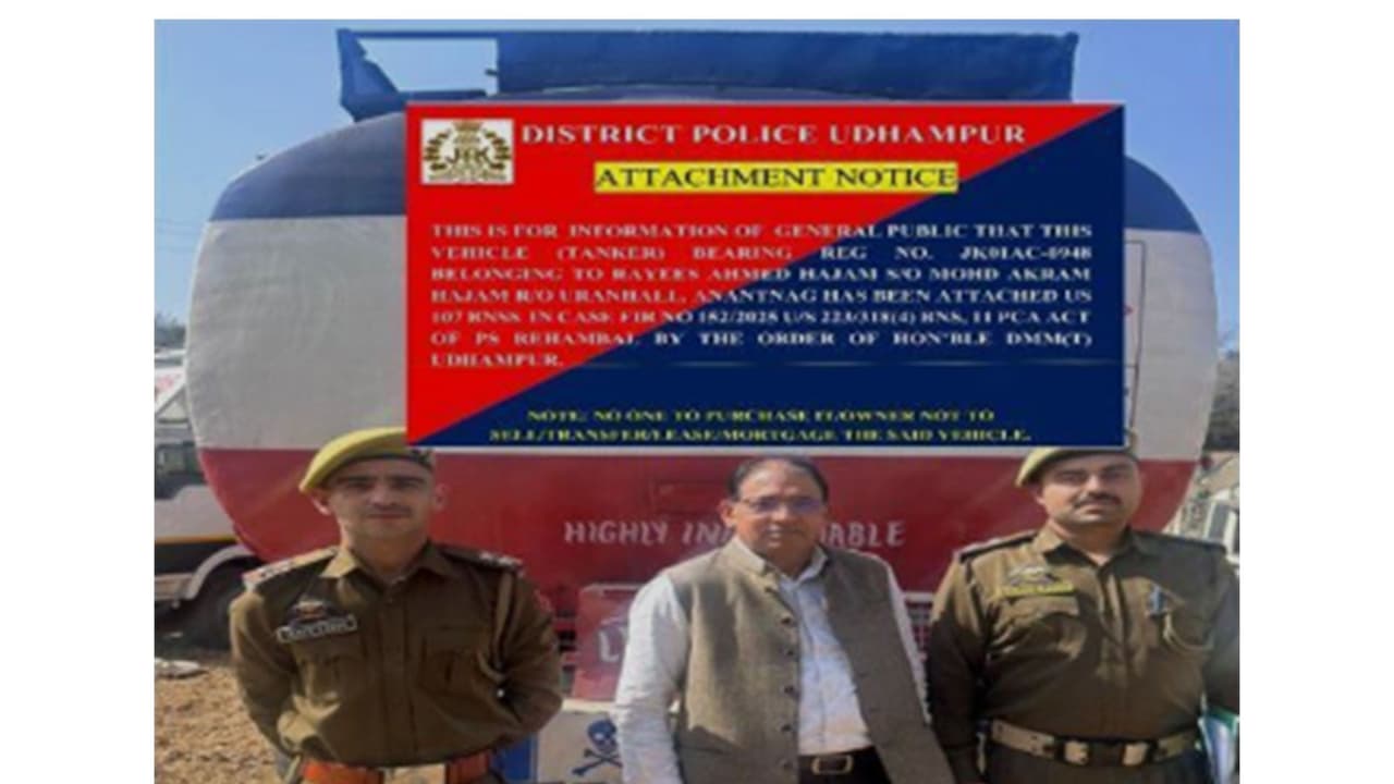 Jammu and Kashmir Police attached a vehicle valued at ₹40 lakh belonging to a habitual bovine smuggler on Thursday. The action was taken under Section 107(5) of the Bharatiya Nagarik Suraksha Sanhita (BNSS), following orders issued by the Court of the District Mobile Magistrate in Udhampur. According to the police, the attached property is a Tata Motors Truck (LPT 2518 TC) owned by Rayees Ahmad Hajam, a resident of Anantnag. The vehicle was found to be involved in multiple offences, including cases registered under Sections 223 and 318(4) of the BNS, as well as Section 11 of the Prevention of Cruelty to Animals (PCA) Act at Police Station Rehambal.