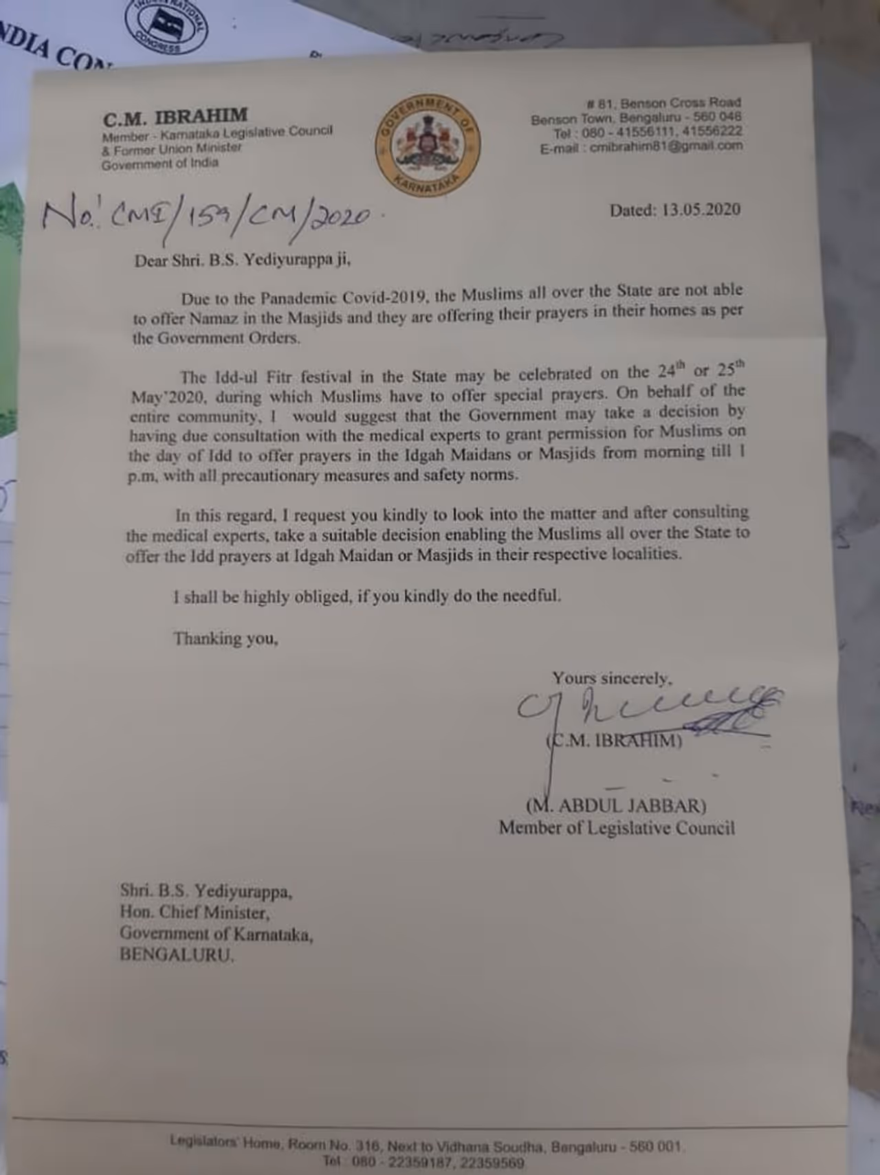 Karnataka Congress MLC CM Ibrahim has urged chief minister Yediyurappa to allow Eid congregation by lifting restrictions on gathering at mosques