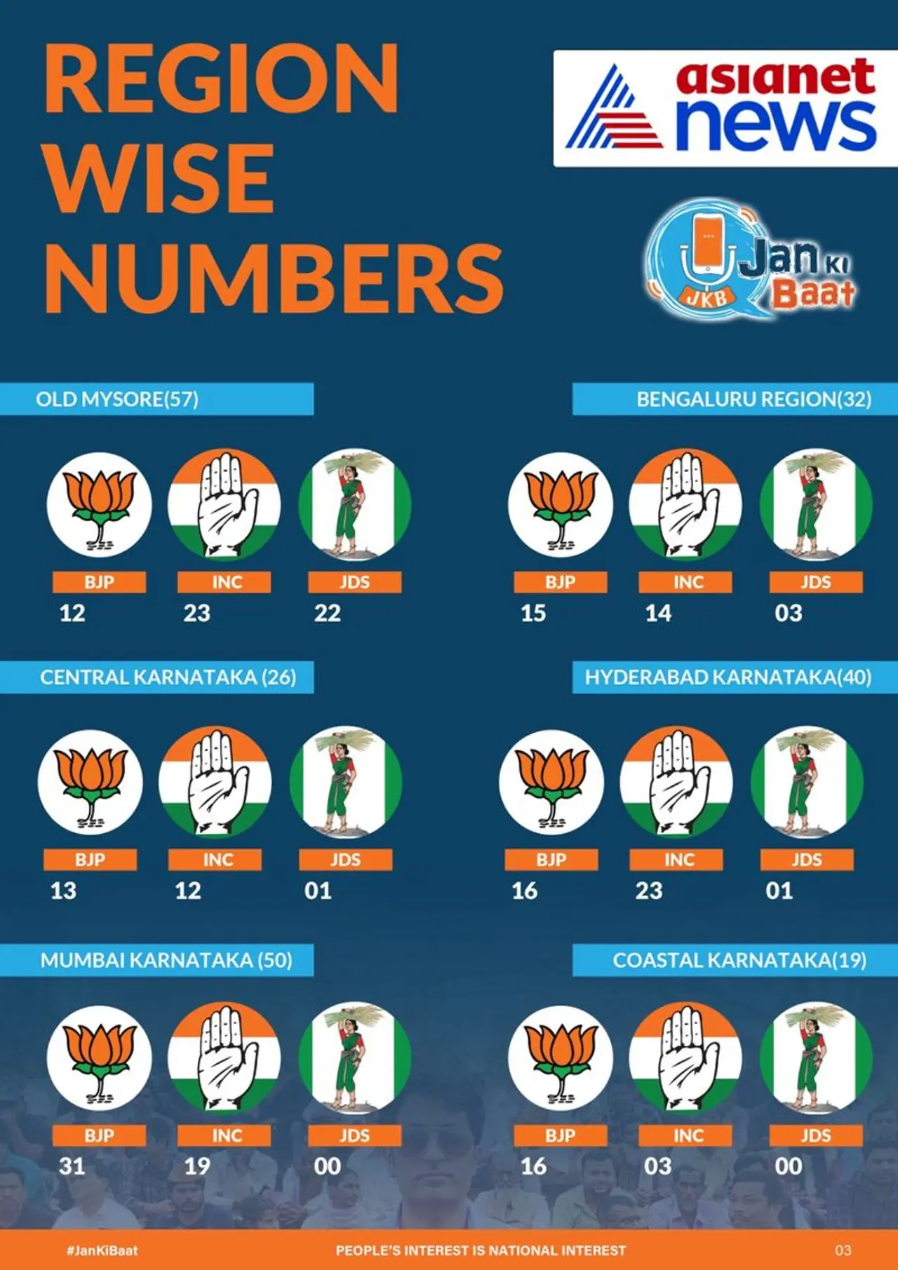 Here's a look at region-wise numbers as per the Asianet News-Jan Ki Baat opinion poll, and how it stands in comparison to the 2018 Karnataka Election: