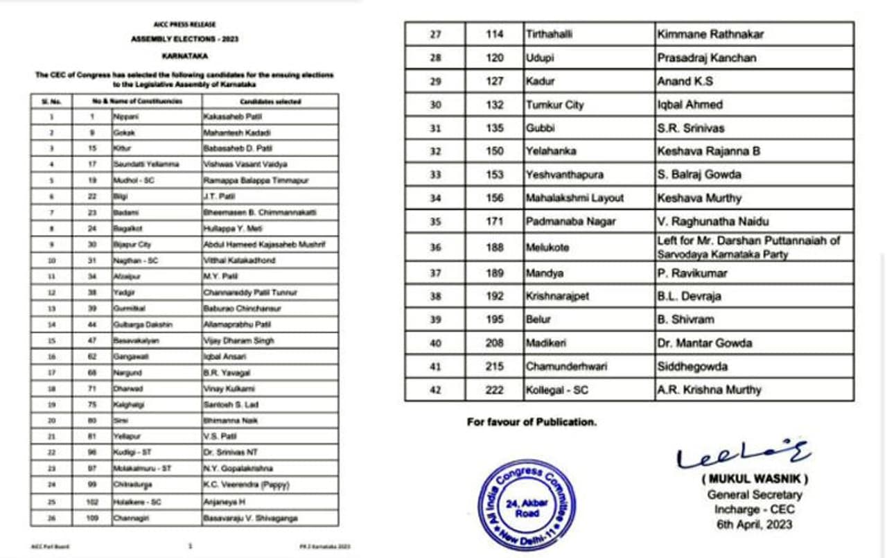 The Congress had on March 25 announced the first list of 124 candidates. With the second list of candidates in 42 constituencies (including in Melukote), the party has so far announced the candidates for 166 out of total 224 seats. The party has to now finalise the list for the remaining 58 seats.