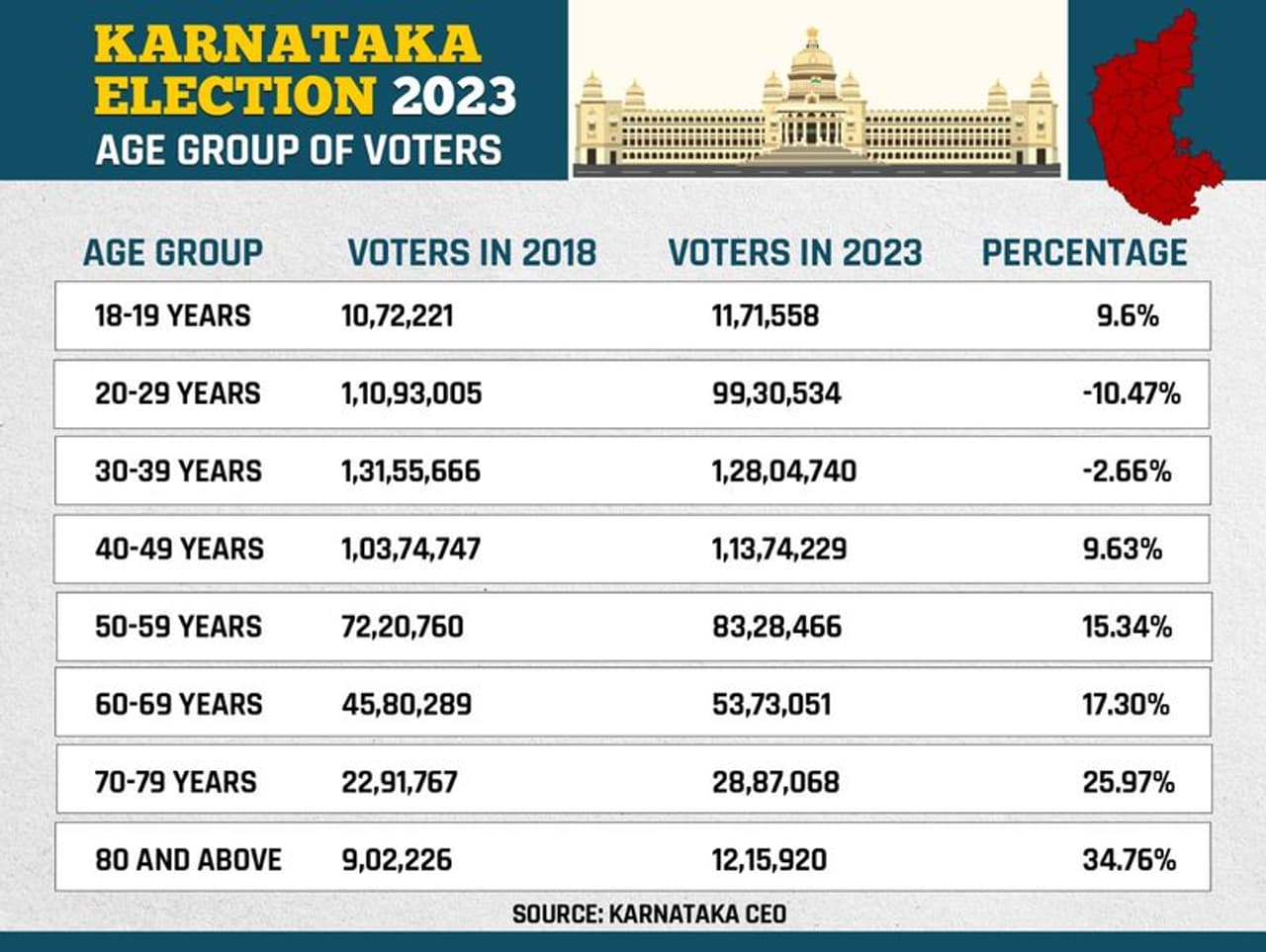 The voters aged 80 and above years above, the highest among all age groups, in poll-bound Karnataka has increased by 34.76 percent since 2018, data from the state election office revealed. Along with this, the state's first-time voters, who are aged between 18 and 19 years, went up by 9.26 percent.
