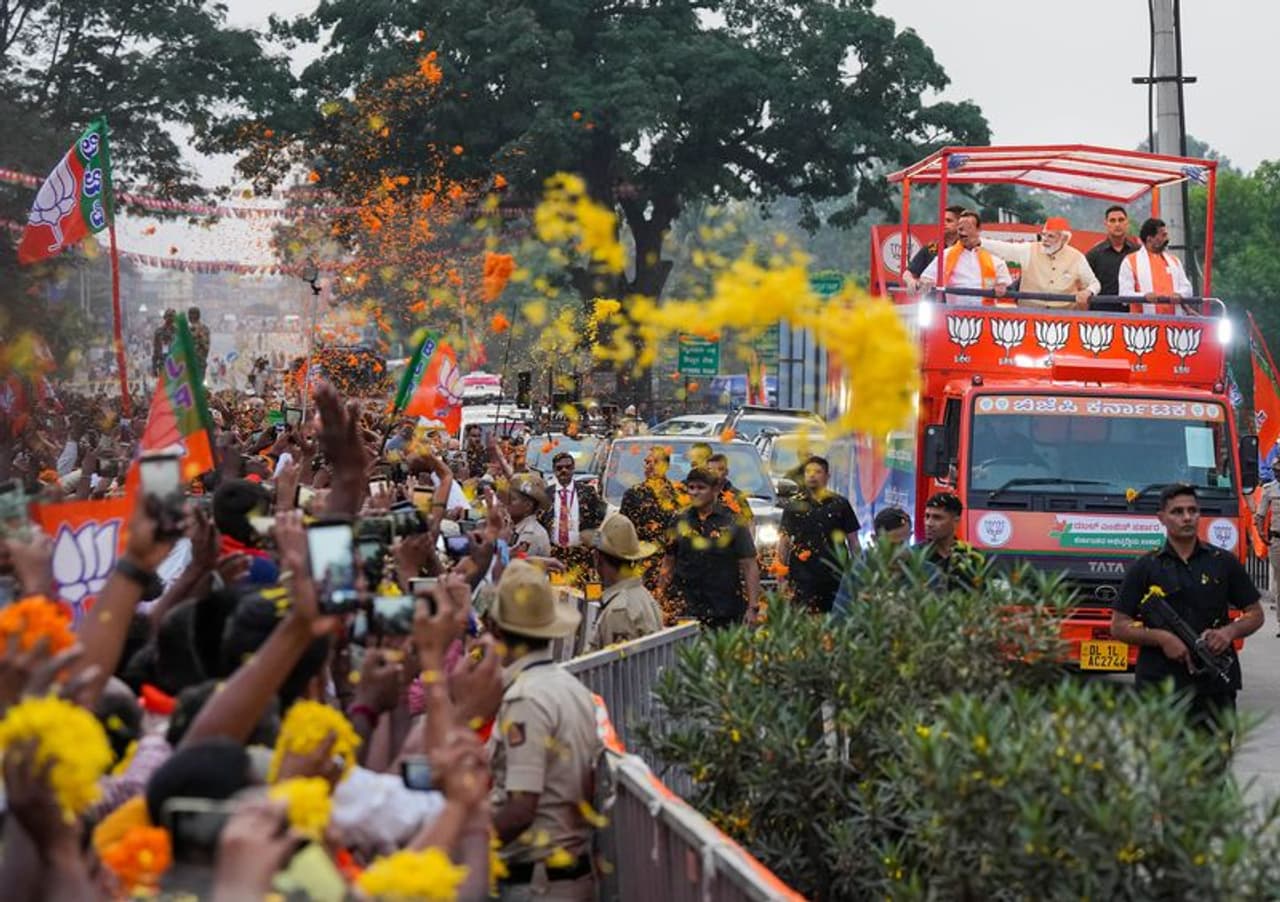 Ending a busy day of electioneering for the BJP in poll-bound Karnataka after back-to-back rallies, Prime Minister Narendra Modi took part in a mega roadshow in north Bengaluru on Saturday drawing an enormous response from a huge crowd.